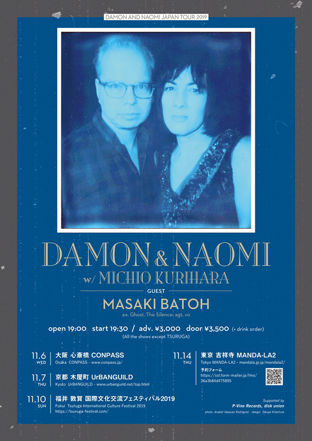 GALAXIE 500〜MAGIC HOURのDamon KrukowskiとNaomi Yangによって1990年代初頭に結成され、米「Shimmy Disc」「Sub Pop」などの名門からの作品群で知られるサイケデリック / ドリーム・フォーク・デュオDamon & Naomiが、11月に来日。昨年末のライヴ・アルバム『不透明度』が話題となった“第3のメンバー”栗原道夫(WHITE HEAVEN〜THE STARS, Boris, GHOST ほか)とのジャパン・ツアーを開催します。