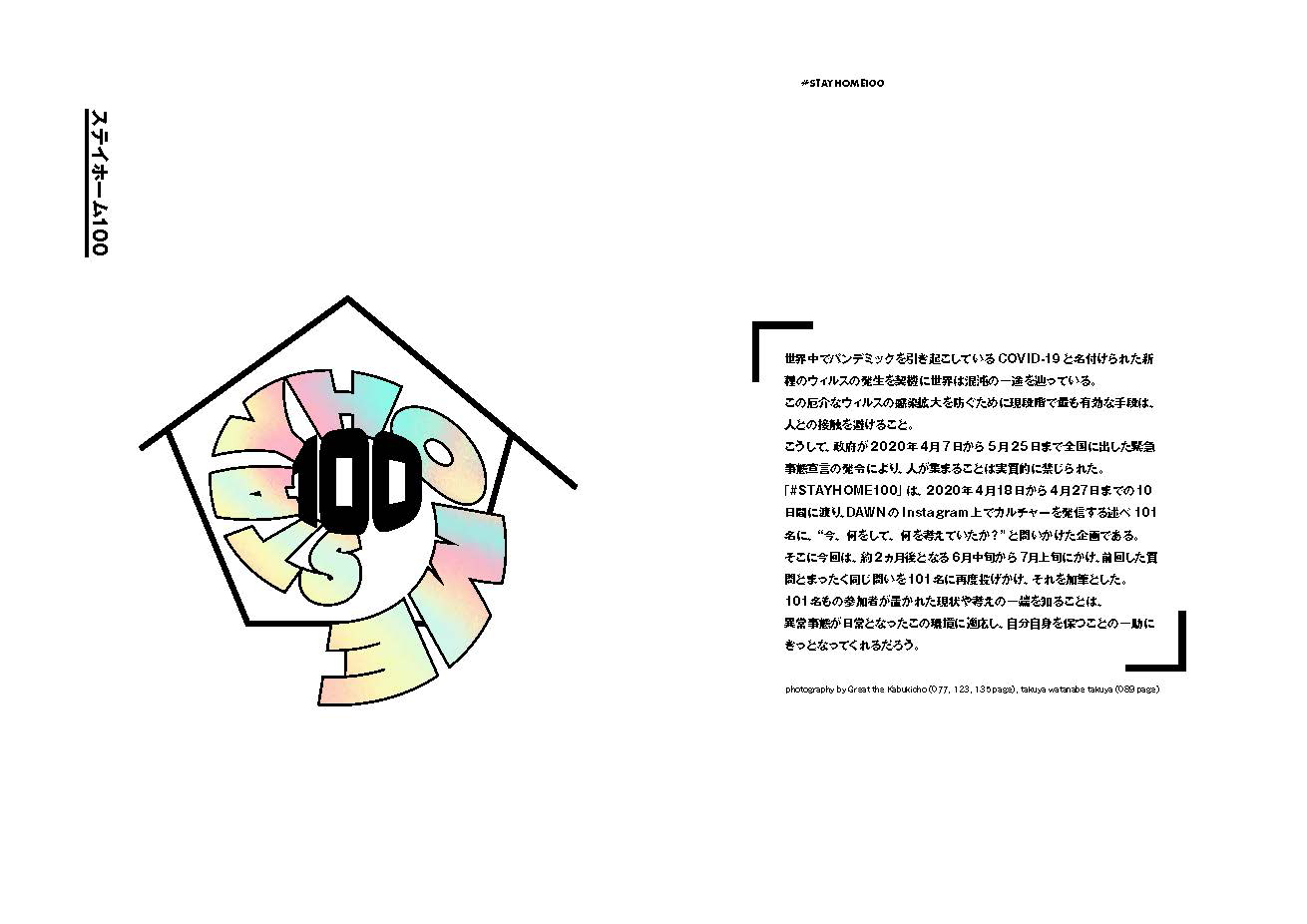 | #STAYHOME100 tofubeats / SANTAWORLDVIEW / オカモトレイジ / Mars89 / SEX Yamaguchi / SITE (Ghetto Hollywood) / 浅沼優子 / Wardaa / KIKI KUDO /GUCCIMAZE / VIDEOTAPEMUSIC / Lil’Yukichi / 蒲谷健太郎 / ShioriyBradshaw / スズキナオ / メテオ / 坂脇 慶 / 荏開津広 / 大石 始 / 徳利 / 釈迦坊主 / COMPUMA / ohiana / 荒井優作 / Masayoshi Iimori / 草下シンヤ / 末次 亘 / 飯田昭雄 / wackwackpress02 / TONAN (ROCKASEN) / 大澤悠大 / 食品まつり a.k.a foodman / 大月壮 / Nukeme /HouxoQue /KM / 細倉真弓 / 磯部 涼 / Le Makeup / moriura / stei / CVN / imdkm / MA1LL / カトウリサ (Ribbon) / 木澤佐登志 / 川谷光平 / 玉名ラーメン / BIM / CICCIO / 寺沢美遊 / okadada / Sir Y.O.K.O.PoLoGod. / 吉岡加奈 / サイプレス上野 / PENNY-O / Qrion /Changsie / 杉山峻輔 / 佐野活人 (WALL & WALL) / セーラーかんな子 / 柳樂光隆 / LIL MERCY (WDsounds) / Kotsu (CYK) / PUNPEE / ぽえむ / LONO3 / 北山雅和 / G.RINA / 宮﨑岳史 / 國本 快 (バレアリック飲食店) / 西田編集長 / DIRTY DIRT / 二木 信 / GREEN ASSASSIN DOLLAR / ぼく脳 / 佐久間裕美子 / Erinam / 鶴岡 龍 / GRADIS NICE / 小嶋真理 / Tasho Ishi / 瀬下翔太 /pootee / 中原真也 (Modern Twist Signs) / UMMMI. / QN / YUA / B.D. / Killa Turner / Taboo1 / KAJI (JOYTOWN TATTOO) / 沖 真秀 / 遠迫憲英 / 粗悪ビーツ / スポーツガーデンひ / SHINKNOWNSUKE / ANI (スチャダラパー) / HIBI BLISS / ZEN-LA-ROCK / DOZAN11