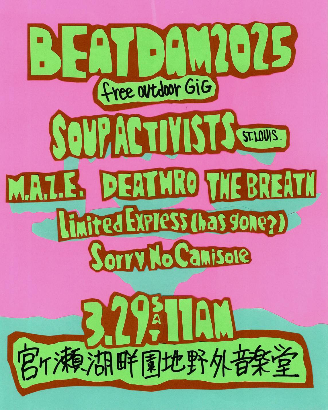 「“BEATDAM”はセントルイスのSOUP ACTIVISTSのツアーの最終日として3月29日にやります。“BEATDAM”は公園で、昔だったら多摩センターの三角広場みたいに、それ目当てじゃない人とか、偶然そこに居合わせた人に向けてもやれるのが好きなんで。さっき話したけど、これから何が起こるかわらかない人に向ける楽しみもあるんで。かつ自分を心得てくれる人たちもいるっていう。ああいうところでやると、その二重の楽しみがある。続けられる限り続けていければいいな、っていう気がします。また都心とかでも野外で唐突にやりたいですね。LOW VISIONの“JUSTICE PARK”とかみたいな」