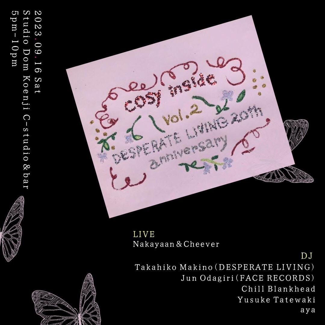 東京・渋谷のヴィンテージ・クローズ / レコード・ショップ「DESPERATE LIVING」の開店20周年を記念して開催される「Cosy Inside vol.2」には、山田裕子(DREAM LANDERS)と共に同店のオーナーを務める牧野孝彦をはじめ、aya、chill blankhead、小田桐 潤(Face Records)、舘脇悠介(Buy Nowers Club | Meditations)がDJとして出演。加えて、nakayaan(ミツメ, SAMOEDO)と千葉麻人(失敗しない生き方)によるデュオ・Nakayaan & Cheeverのスペシャルなライヴ・パフォーマンスも予定されています。