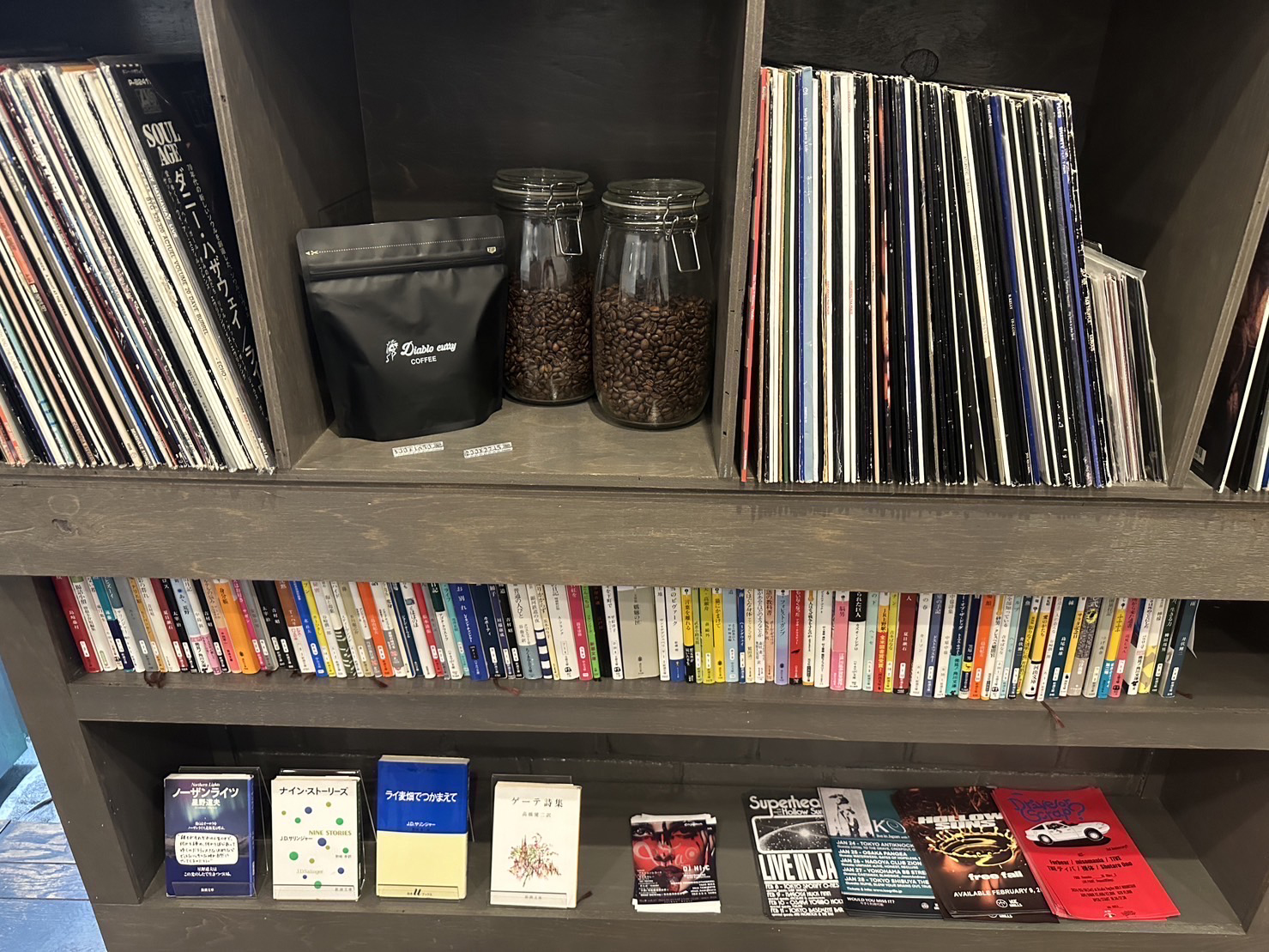 M 「展望というか、報告みたいになりますが、メインの辛いスリランカ・ベースのカレーは、看板なのでそのまま置いておきつつ、看板商品レベルの辛さが苦手なかたにも、“辛さ控えめ“の『ココナッツチキンカレー』は食べやすくていいと思います。両方同時に楽しめる『あいがけカレー』も始まりました。テイクアウトやUber Eatsもできるようになったので、ぜひご利用ください。カルダモンがアクセントになっているラッシーも仕上がりました。多数の友人バイヤーさんがセレクトしてくれた中古レコードをゆっくり見られたり買えたり、ヴィンテージ雑貨も。どちらも定期的に入れ替わっていくので僕も楽しいですね。また、2024年の春頃までには?ヴィンテージ・ポスターのコレクターさんが協力してくれて、展示販売を開始予定です。友達の本屋さんが厳選してくれた古本の小説等の展示販売も始まって、ゆるりと入れ替わっていくのですが、名作揃いで最高です。カレーを待つ時間もいろいろ楽しめて、ちょっと変わったカレー屋でおもしろいと思います。Diablo curry堀江のオリジナル・レトルトも現在新しく制作中ですね。こちらができれば全国のご家庭でも食べられます。やることたくさんですね。まぁマイペースにがんばります(笑)」