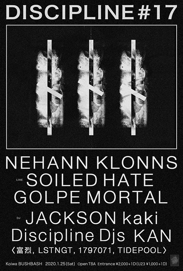 同公演には、往年のポジティヴ・パンク / デス・ロックをポスト・グランジおよび近年のポストパンク・リヴァイヴァル以降の感覚で咀嚼したかの如き音楽性で注目を浴びるNEHANN、DEADBODIESEVERYWHEREやKUNGFU RICKなどに通ずるブルータル・スタイルのパワーヴァイオレンスで話題のSOILED HATE、テクノイズ / インダストリアル / EBMを洗練させたビートメイキングが反響を呼び、「JOHN LAWRENCE SULLIVAN」のランウェイも飾っているGOLPE MORTAL、昨年12月に最新EP『VVLGAR』を発表したばかりの「Discipline」ファウンダーKLONNSが出演。DJは、Rollo and LeapsのドラマーでもあるJACKSON kaki、ペインターとしても活躍するKAN、おなじみDiscipline DJs(富烈 Granule, LSTNGT, 1797071, TIDEPOOL)が担当します。