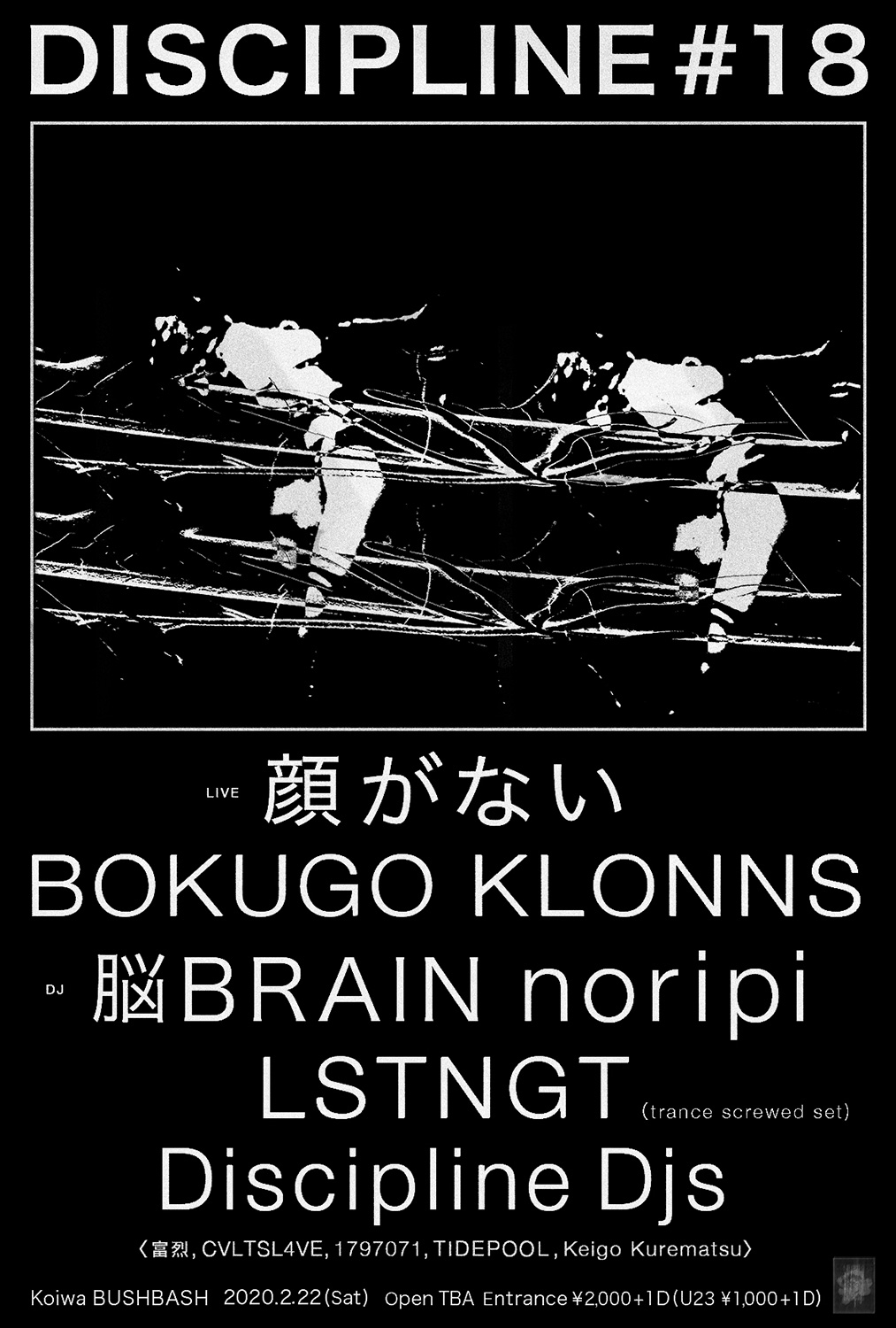 “崩壊”をテーマに開催される「Discipline #18」には、ちゃんめぐ aka 格差社会と組んだ“チュウソツシスターズ”(活動休止中)の一員としても知られ、昨年はB.yhzz、Chino Amobi、Lilly Kaneらと共にポーランド・ワルシャワ「IA(Intruder Alert)」のコンピレーション『Love Songs』に参加して話題となった透湖 aka BOKUGOが静岡から出演するほか、昨年12月に「aufnahme + wiedergabe」主催イベントでのドイツ・ベルリン公演を敢行したジャンク・インダストリアル・デュオ“顔がない”、『VVLGAR』に続く新作の発表が待たれるKLONNSがライヴ・パフォーマンス。DJは、DisciplineレジデントLSTNGTによる“trance screwed set”に加え、ピアノ男とのデュオ“リョウコ2000”で発表したEP『Parasitic Dominator』が好評のnoripi、DJ ACID A MANNER名義での12″ヴァイナル『XPERIENCE TRAXXX』を発表したばかりの脳BRAIN、Discipline DJs(富烈 Granule, 1797071, CVLTSL4VE, TIDEPOOL, Keigo Kurematsu)がスピン。