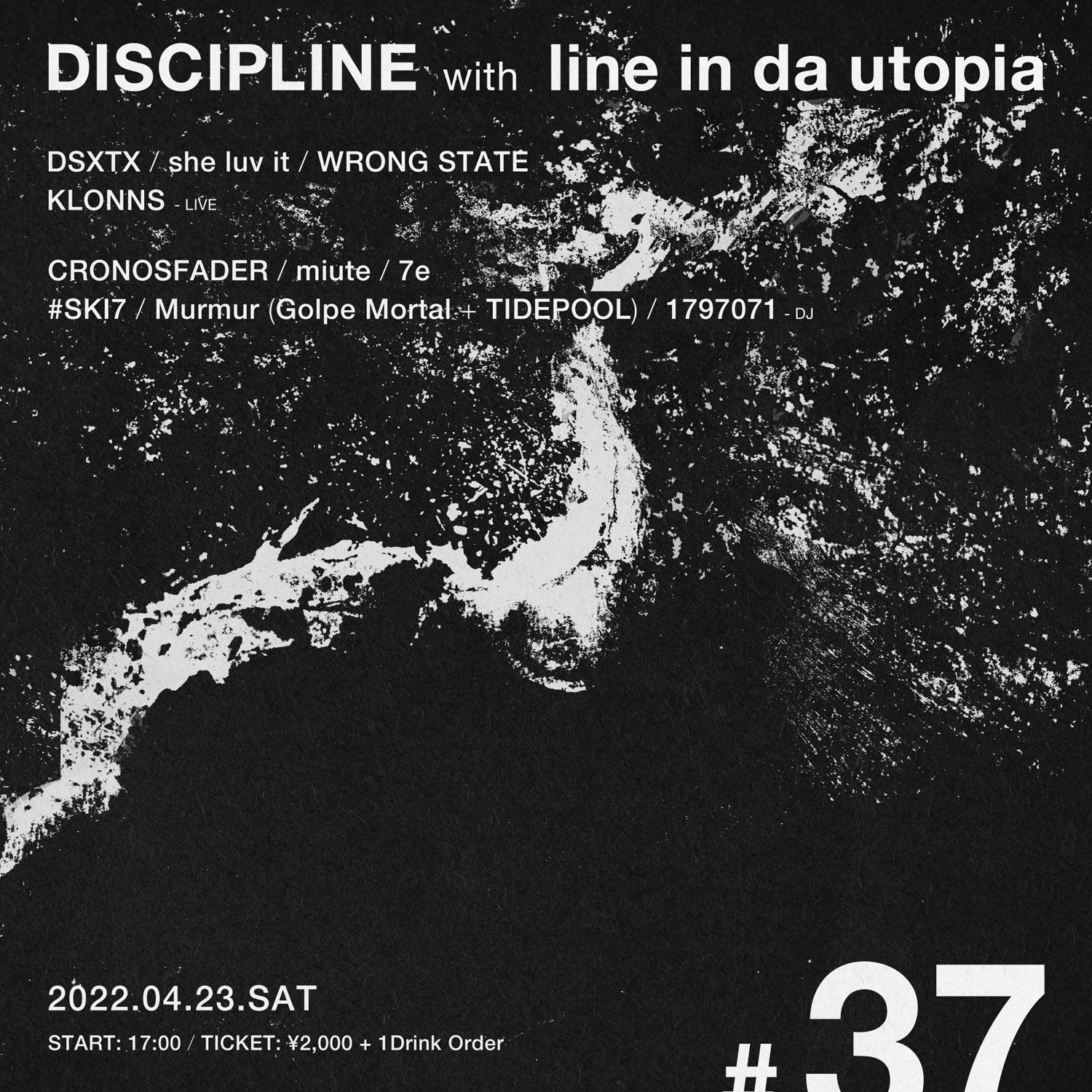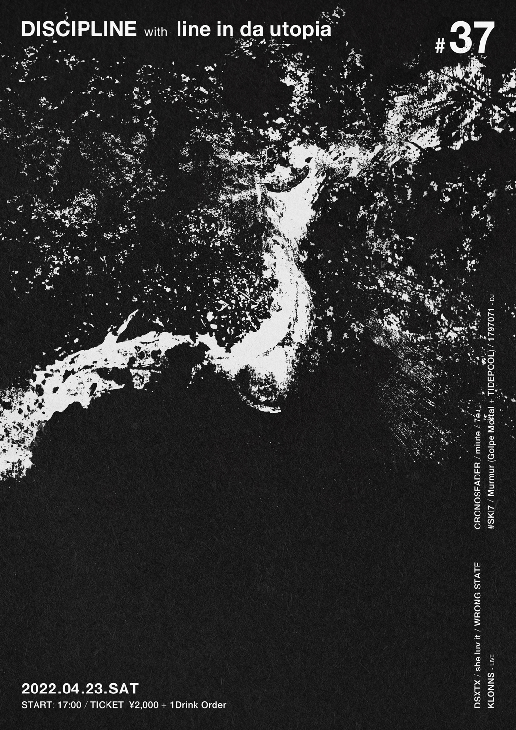 目下最新EP『CROW』が話題のKLONNSを中心に東京・小岩 BUSHBASHにて隔月で開催され、Blessed Blood Vulva、Mari Sakurai、ROTTENLAVA II、Wolf Creek、yumesakiらを迎えた2月の第36回も好評を博したパーティ「Discipline」が、第37回を4月23日(土)に開催。