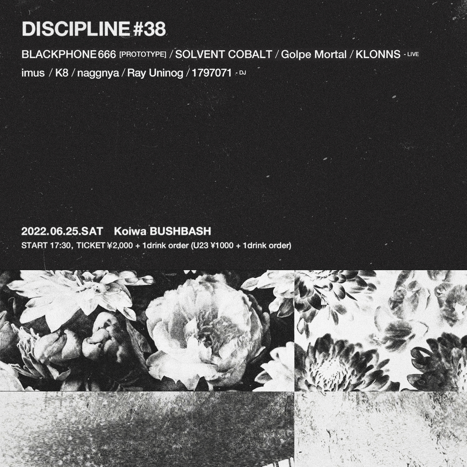 東京・小岩 BUSHBASHにて隔月で開催され、4月はFlux(atmosphäre | CTNU, orhythmo, RED, she luv it etc.)主催「line in da utopia.」とのコラボレーションが好評を博したパーティ「Discipline」が、第38回を同地にて6月25日(土)に開催。
