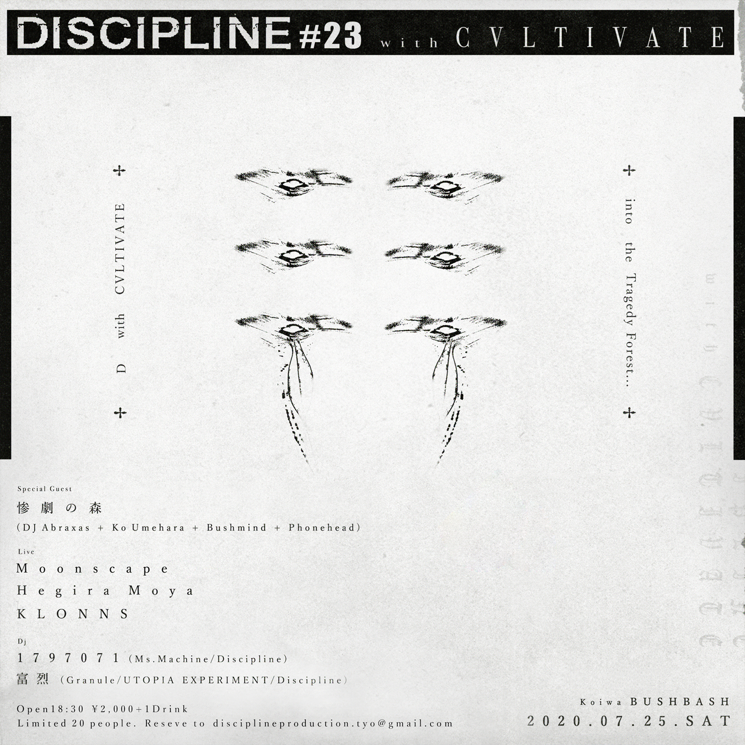なおDISCIPLINEは、CVLTSL4VE aka Hate(MOONSCAPE)主催「CVLTIVATE」とのコラボレート・イベント「Discipline #23 with CVLTIVATE」を7月25日(土)にBUSHBASHにて開催。