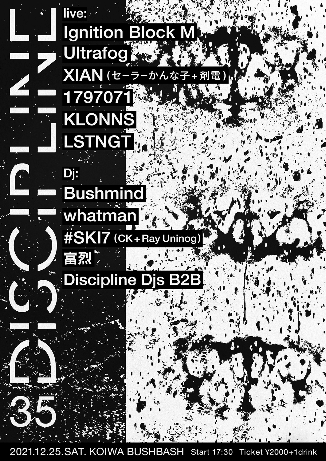 DEAD BITCH『self-vandalism』、KLONNS / SOILED HATE『DIFFERENT SENSES split』のリリースでレーベルとしても注目を浴び、2022年1月には鬼才・剤電による1stフル・アルバムの発表も控えるコレクティヴ「Discipline」が、東京・小岩 BUSHBASHにて継続するパーティの第35回を12月25日(土)に開催。
