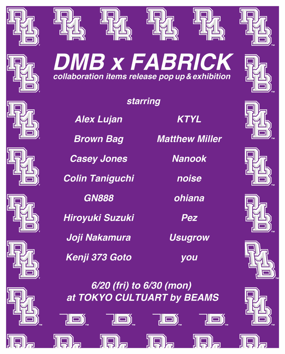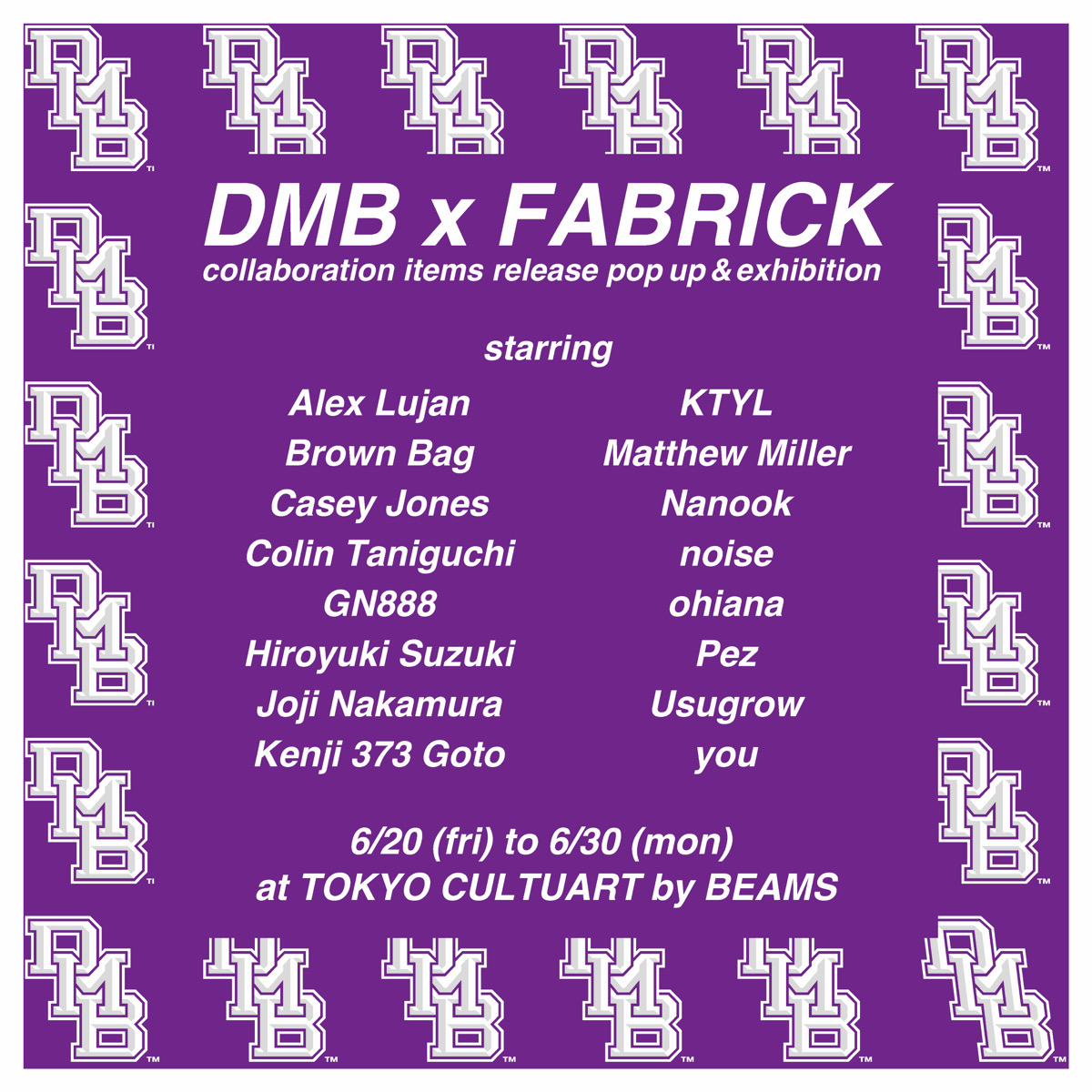 ハードコア・パンク、ヒップホップ、グラフィティ、スケートをはじめとするストリート・カルチャーを独自の切り口で捉え、様々な領域とのミックスを試みてきたKemmy 3000(DREADEYE)主宰レーベル「DMB PRODUCTION」と、『BE@RBRICK』でおなじみのトイ・メーカー「MEDICOM TOY」が展開するテキスタイル・ブランド「FABRICK®」がコラボレーション。これを記念したポップアップ・イベントが6月20日(金)から30日(月)にかけて東京・新宿 TOKYO CULTUART by BEAMS(BEAMS JAPAN 4F)にて開催されます。