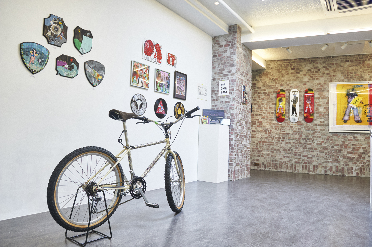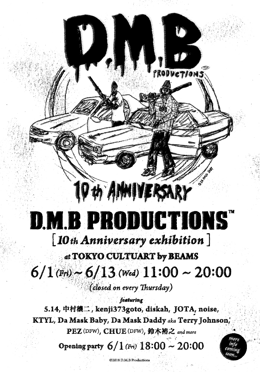 「『DMB Capital Punishment』のリリースから10年経ったのに、ろくに活動していない期間がほとんどだったので、このままじゃDMB PRODUCTIONが終わってしまうのではないかという危機感から、10年の節目になにかひとつぶちあげようと思って企画しました。これもジョージくんにCULTUARTの小川くん(小川喜之)を紹介してもらって、イベントをやらせてもらいました。スペシャル感とDMBらしさを出そうと思って、とにかく付き合いのあるかたを集めて展示を開催したという感じです。オープニングでTHRASH ZONE(神奈川・横浜)のビールを出してもらったり、SUNDAYS BEST(東京・中目黒)の横瀬(裕貴)くんにはタコスで参加してもらったり、むちゃくちゃですよね(笑)。最初はDJもなしでやろうと思っていたんですけど、今里さんから“DJやらせてください”という連絡があって、それならやるしかないな、ということで……結果、たくさんの人が集まってくれて、とても楽しかったですね。なかなか一箇所に集まらない人たちが一同に会して、全然混ざり合わないという(笑)。高校の頃にバンドをやっていた同級生も来てくれました(笑)。TerryさんはGラップ・シンジケート……というのと、ロゴを作ってくれたのがFlamingo Studioのリッキーということもあって、参加してもらいました。Tシャツのデザインやスケートボードのデザインなど、いろうろとやっていただけ楽しかったです。参加をお願いする経緯もあったんですけど、個人的なところなのでこっそり聞きにきてください(笑)」