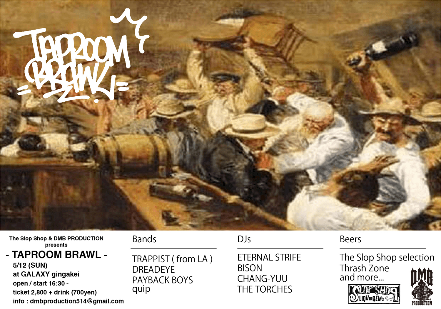 「DMBはもともとモッシュ・クルーで、NYHCやニュースクール・スタイル以外のライヴでいかにウィンドミルをするかということを研究する集団です。OS3が“Dirty Mosh Brigade”って言い出したので、リーダーはOS3です。PAYBACK BOYSはバンド・メンバーがDMBなので、自分たちのライヴではモッシャー不足で盛り上がり難いというのがジレンマだったのではないでしょうか。近年はメンバーの高齢化により影を潜めていますが、たまに軍神が爆発する瞬間がありますね。それからは、DMBを頭文字にした“あいうえお作文”を僕が毎回考えて、それをテーマにアイテムを作っています。ネタ不足なのでお題は募集しています」