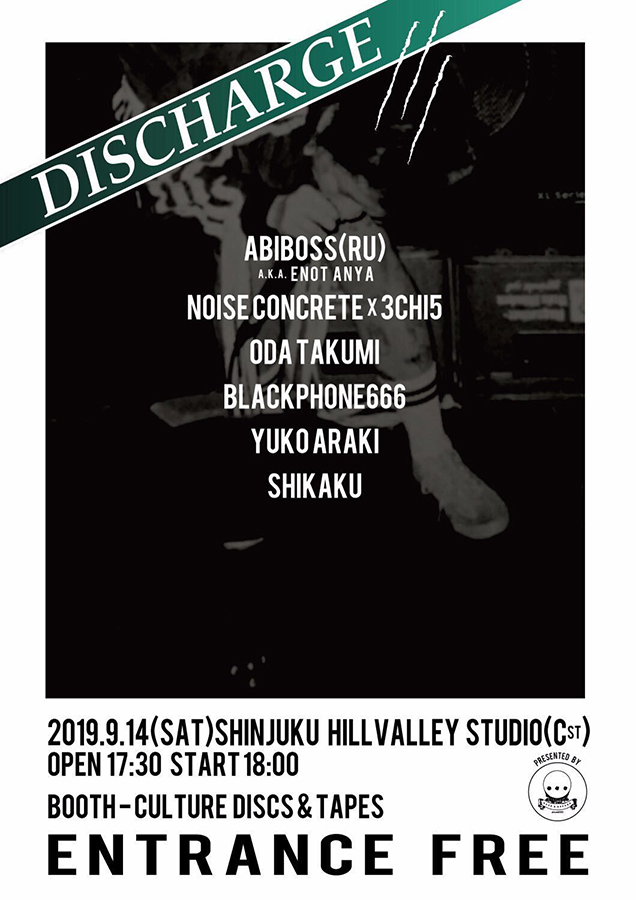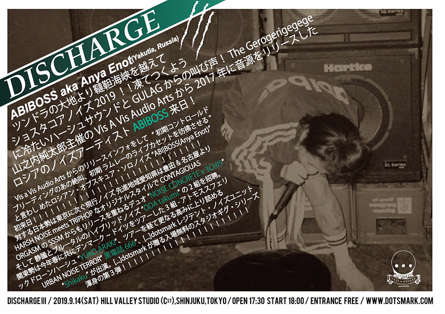 2017年の初回には中国から梅志勇(Mei Zhiyong)、昨年の第2回には台湾からJared Xu aka Berserkが参加している「DISCHARGE」。今回は、過去に山之内純太郎(THE GEROGERIGEGEGE)主宰レーベル「Vis A Vis Audio Arts」からカセットテープ作品『Horizonal Rain』を発表しているAnya Enotが、ソロ・プロジェクト“Abiboss”として永久凍土の街、ロシア連邦サハ共和国の首都ヤクーツクから来日。NOISE CONCRETE x 3CHI5、ODA takumi、黒電話666、Yuko Araki、shikakuとの共演が決定しています。当日は[…]dotsmark運営のオンライン・ストア「CULTURE discs & tapes」もオフライン出店。