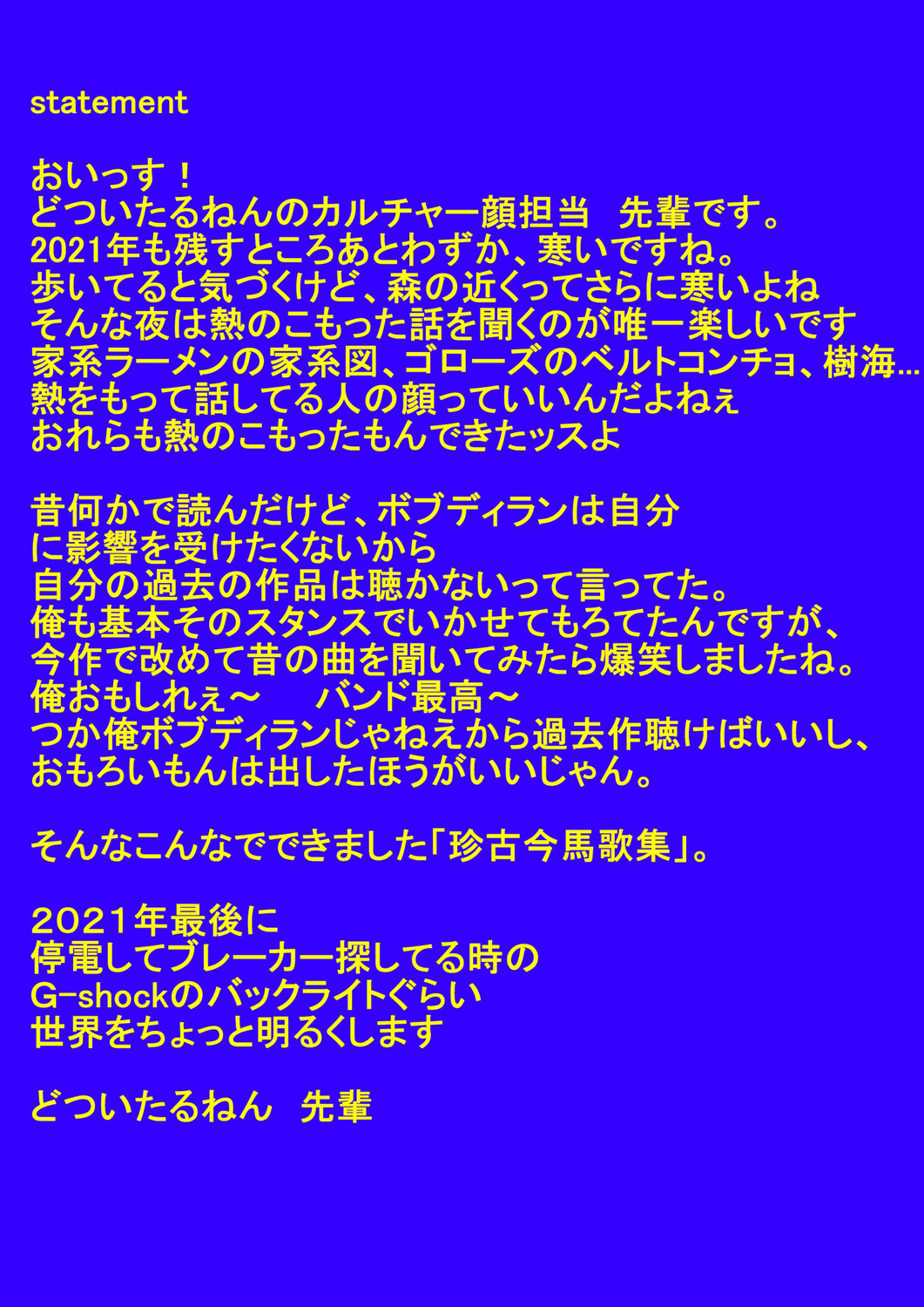 ワトソン、先輩、うーちゃんのトリオ編制となった現体制では初の作品となる『珍古今馬歌集』には、“BIGBOSS”として高橋 翔が参加。カヴァー・アートを沖 真秀が手がけたパッケージは、竹皮に手詰めした特殊仕様。どついたるねんオンライン・ストアでは、12月25日(土)までの注文分にメンバーからの年賀状が付属します。