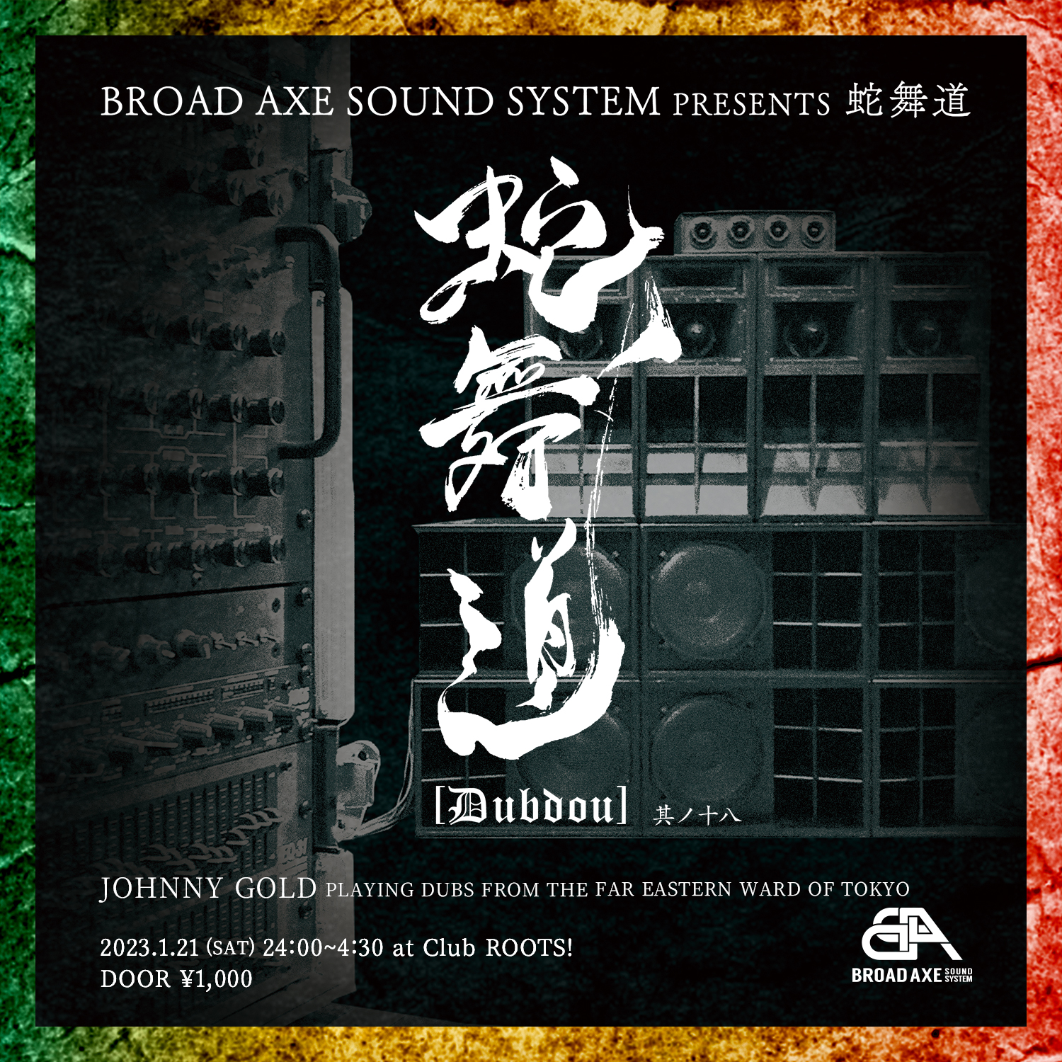 Goth-Trad主催パーティ「Back To Chill」をはじめとするベース・ミュージックの現場に留まらず、エクストリームな低音をロック、テクノ、レフトフィールドにまで幅広く対応させてきたサウンドシステム「Broad Axe Sound System」が、主催イベント「蛇舞道」の第18回を東京・高円寺 Club ROOTS!にて1月21日(土)に開催。
