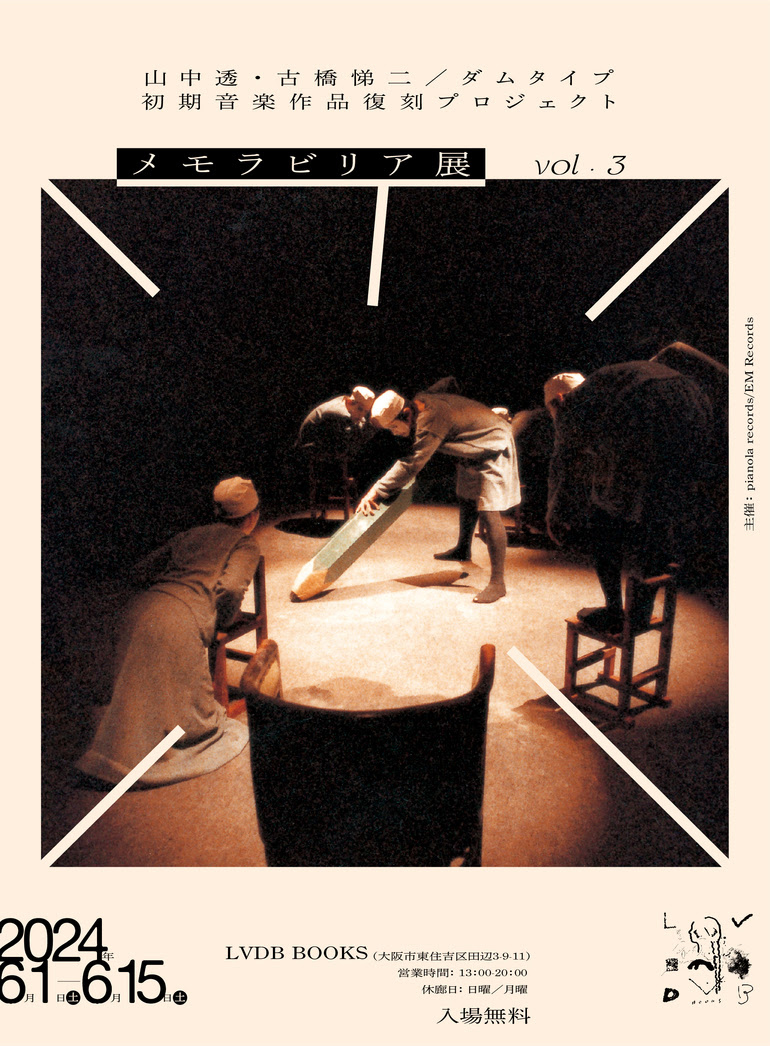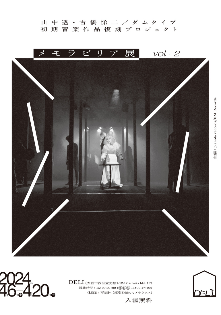 また本プロジェクトに合わせ、R-STILL~初期DUMB TYPEのアート・ピースやフライヤー、ポスター、関連記事、制作メモなどが出展されるメモラビリア展を実施。昨年10月の東京・高円寺 タタ bookshop / galleryでの開催に続き、山中の新作リリースを控えているという江村幸紀主宰「EM Records」との共同企画展が4月20日(土)まで大阪・立売堀 DELIにて開催されているほか、6月1日(土)から15日(土)にかけては大阪・東住吉 LVDB BOOKSへの巡回が予定されています。