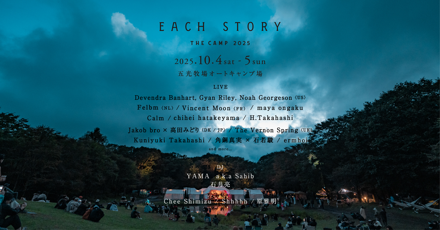を標榜し、5周年を迎える「EACH STORY ~THE CAMP~」。今年は10月4日(土)、5日(日)の2日間に亘って長野・南佐久 五光牧場オートキャンプ場にて開催される同イベントが、出演者第2弾を発表。
