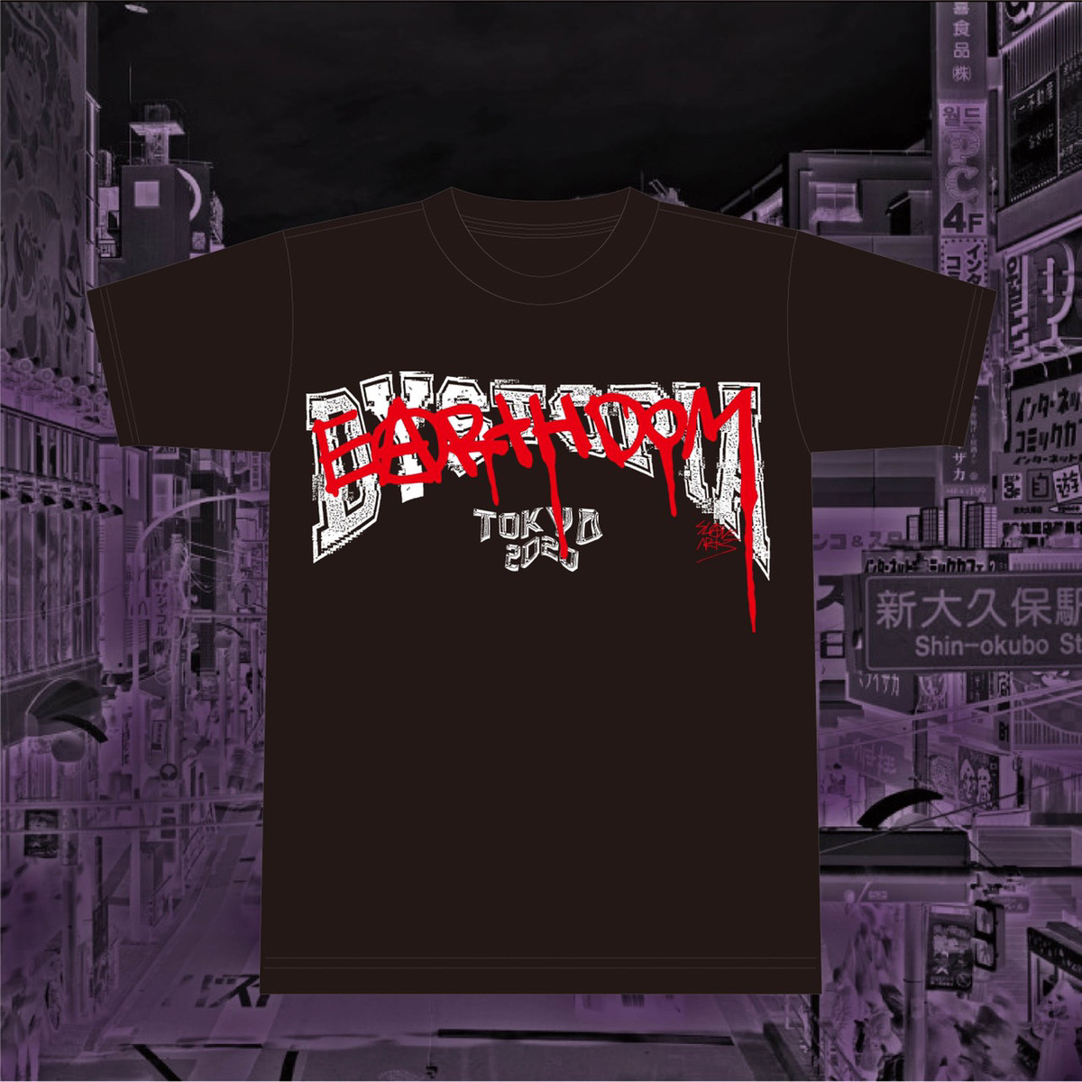 また、6月に受注販売が実施され、現在はEARTHDOMのオンライン・ストアにてリプリントを販売中の河村康輔、Gabba aka SCUMPUTER(CHAOS U.K., F.U.K.)によるTシャツに続き、ディレクター・那倉太一(ENDON)とデザイナー・玉野勇希(UNCIVILIZED GIRLS MEMORY, ZENOCIDE)が中核を担うアパレル・ブランド「SLAVEARTS®︎」とコラボレートしたベネフィットTシャツの販売もスタート。同ブランドの定番アイテムとなった『DYSTOPIA TOKYO』に、“EARTHDOM”のレターがオーヴァーレイであしらわれたデザインです。