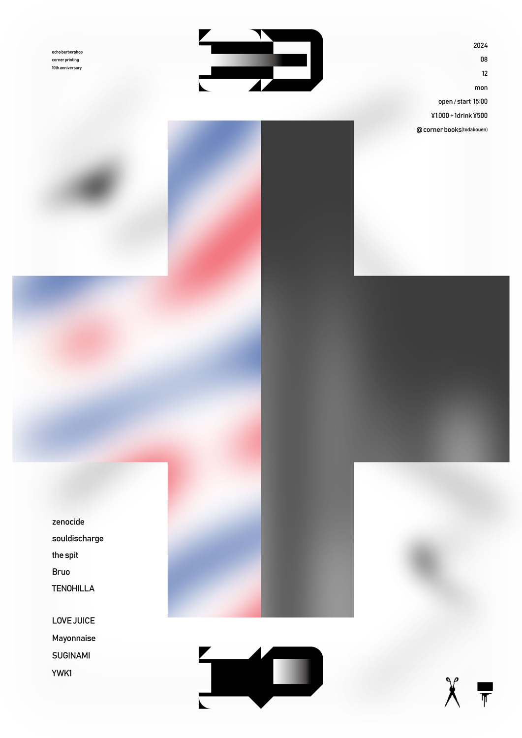 同公演では、「ECHO barbershop」店主が所属するSoulDischarge、創業者を含む「CORNER PRINTING」の面々で構成されるZENOCIDEをはじめ、HETH、ONLY THE LAST SONG、WRONG STATEなどのメンバーによって結成され、3月にデモ音源を発表したばかりの新鋭・Bruo、ZENOCIDE同様「CORNER PRINTING」のスタッフが在籍し、7月はTHE BREATH『道理なき憎悪 Reasonless Hate』リリース・ショウへの出演が話題となったTHE SPIT、「CORNER PRINTING」スタッフでもあるRepYourSelf・W@Rとビートメイカー・RyuSakuのデュオ・TENOHILLAがライヴ・パフォーマンス。DJとしてLOVE JUICE、Mayonnaise、SUGINAMI、YWK1の出演も決定しています。