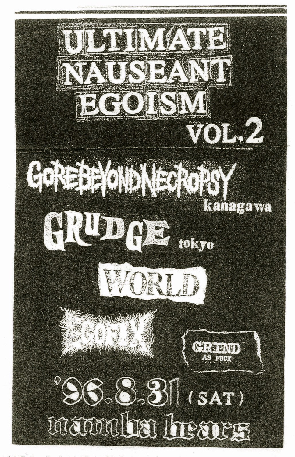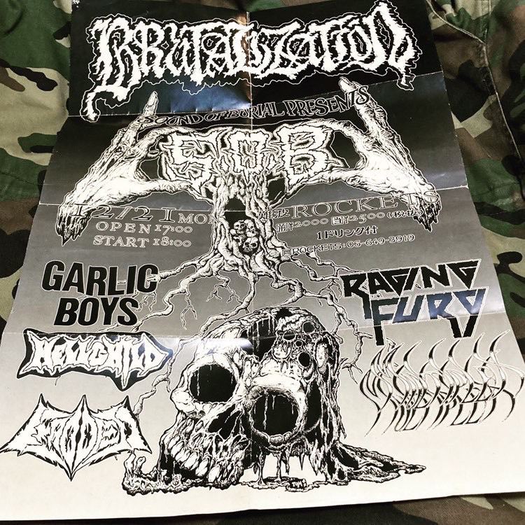 Y 「大阪・十三 FandangoでSHELLSHOCKとGARLIC BOYSの2マン・ライヴがあって、そのときにシークレットで『What’s The Truth?』をリリースした頃のSxOxBが突然出てきて、それを観て衝撃を受けたな。あと京都でBloodbath Recordsっていうレーベルをやってた木村っていう奴がいて、京都ですごい盛り上がりを見せていた影響もあって、俺らもグラインドコアやらなあかんのちゃうんという感じになってた(笑)」