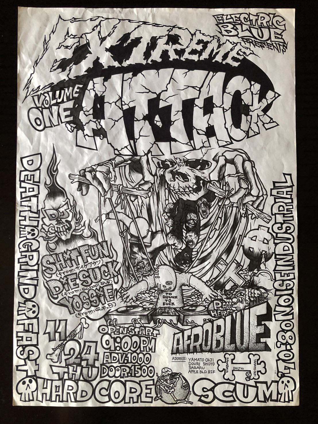 DS 「そうなんすよ。僕、サイケアウツっていう打ち込みのバンドやってたんですけど、そのリーダーの大橋(アキラ)さんって言う人にYossieを紹介されたんですよ。京都のフィッシュ & チップスっていうバーで。大橋さんから“YossieはSxOxBとNAPALM DEATHのスプリットのジャケットも描いてんねんで”って言われて、ほんで、なにコイツすごいな、ってなって。それから仲良くなって、大橋さんとYossieと俺とかでDJイベントやってたんですよ(笑)。Yossieがファストコア / ハードコア、大橋さんがノイズ / インダストリアル / ジャングル、俺がデスメタル / グラインドでやってた“Extreme Attack”っていうDJイベント(笑)。そのときに大橋さんに“大作、お前DJネーム要るわ!”って言われて。ほんで“DIE-SUCKにしとけ!”って言われて決まったんですわ(笑)」