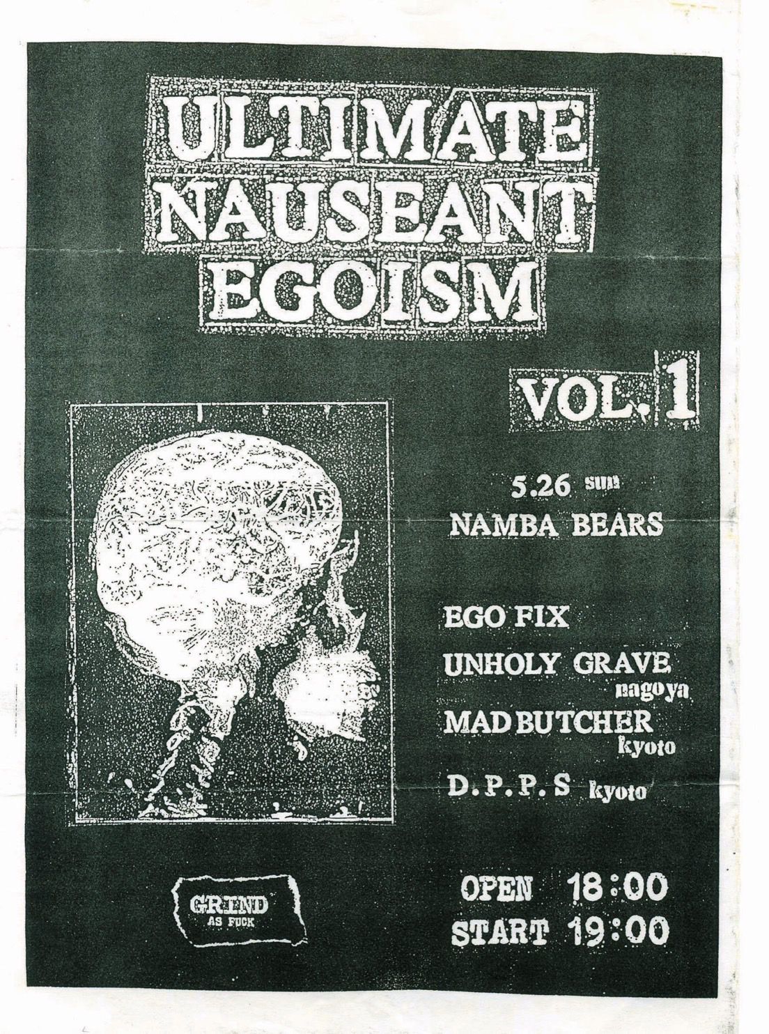 余談はさておき、日本には90年代初頭からMULTIPLEX、GIBBED、SATANIC HELL SLAUGHTERなどに続くハードコア・パンクの流れを汲んだグラインドコア・バンドが存在した。例えば、まだEXIT-13をやっていたBill Yurkiewiczがオーナーだった頃の「Relapse Records」からアルバム(1998)をリリースしているGORE BEYOND NECROPSYは、CARCASS、FEAR OF GOD、NAPALM DEATH、CARCASS、SORE THROATなどを思わせるUKハードコア流れのグラインドコアに、SPKやWHITEHOUSEから影響を受けたというノイズを全面的に押し出した、レコーディングもアートワークも全てDIYでやってしまう、今では少なくなったスタイルのバンドだ。他にもUNHOLY GRAVEや、WORLD、SENSELESS APOCALYPSE、CARCASS GRINDERなど全国各地にグラインドコア・バンドが産声を上げた。EGO FIXはバンド名を曲のタイトルから引用しているようにSxOxBからの影響は絶大なものだと思うが、当時デモを聴いて感じたのは「もし『What’s The Truth』(1990)と『Gate Of Doom』(1993)の間にアルバムがあったら、このデモみたいな音楽かもしれない」ということ。80年代後半から90年代初頭のデスメタルを感じさせる、ザクザクとしたメタリックなギターリフを中心としたハードコア・パンクの延長線にあるグラインドコアは、相当にメタリックであるのにまるでメタルではないところが最高だ。この絶妙な塩梅は事実上の首謀者である前川氏のセンスによるものであり、そこに各メンバーの持ち寄った要素がクロスオーヴァーした結果、EGO FIX独自のグラインドコアが完成している。