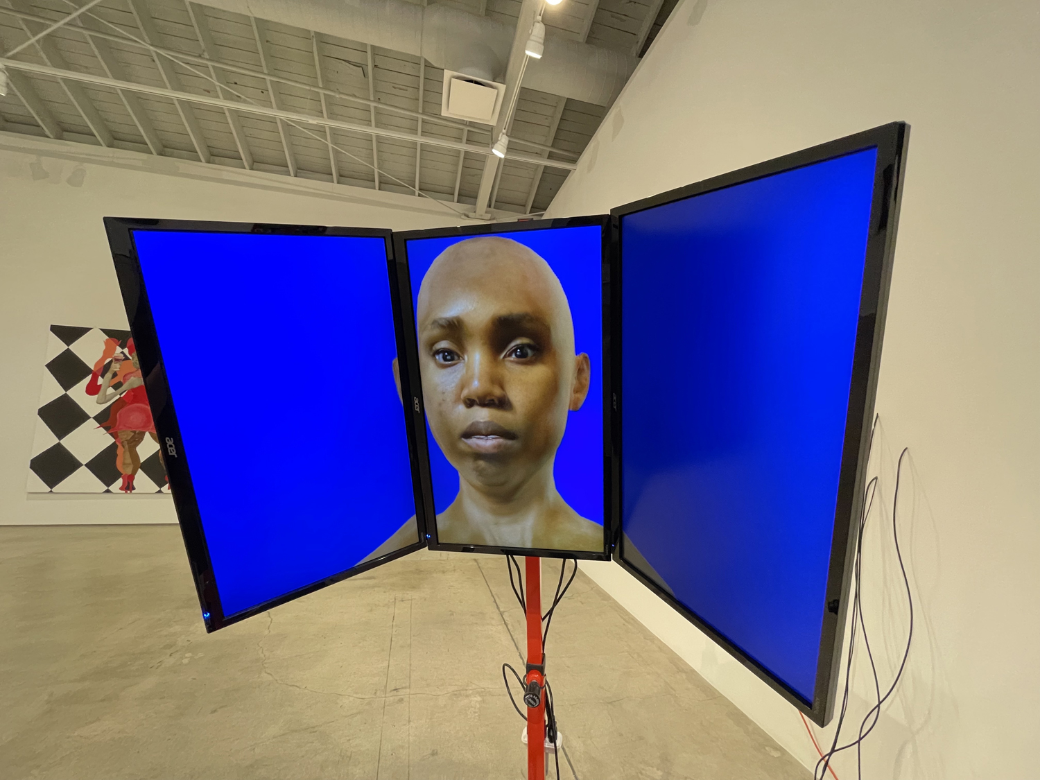 「おそらくLegacyが担当した部分は、主にジェンダー、セクシャリティ、レイスの規範で以って支配しようとするテクノロジーを、いかにアーティストの身体がパフォーマンスなどのあらゆる芸術言語で抗っていくか、テクノロジーに対してグリッチ / 故障をどう仕掛けていくかということが主題になっていると読み取れました。カタログはありますかと聞いたら、ないのですが、この本がベースとなっていますと渡されたのがLegacyの『Glitch Feminism』でした。展示作家の中でも注目したのは、やはりブラック・フェミニスト的な文脈で作品を展開していたSondra PerryやHannah Blackですね。特にSondra PerryはThe Kitchenでも過去に展示をしている作家で、レイスやジェンダーがニュー・メディアの中でどう言語化されていくのかをテーマとした作品を制作しています。代表作の『Graft and Ash for a Three Monitor Workstation』(2016)が展示されていましたが、3D空間の中でアヴァターとして登場するブラック・ボディが、どのようにポーションされていくかを作品で表現しています。この作品は鑑賞者の身体と連動して操作することが出来るので、より主体的に作品と接続することができ、主体客体の二元的な状態を転覆しようとしていますね」