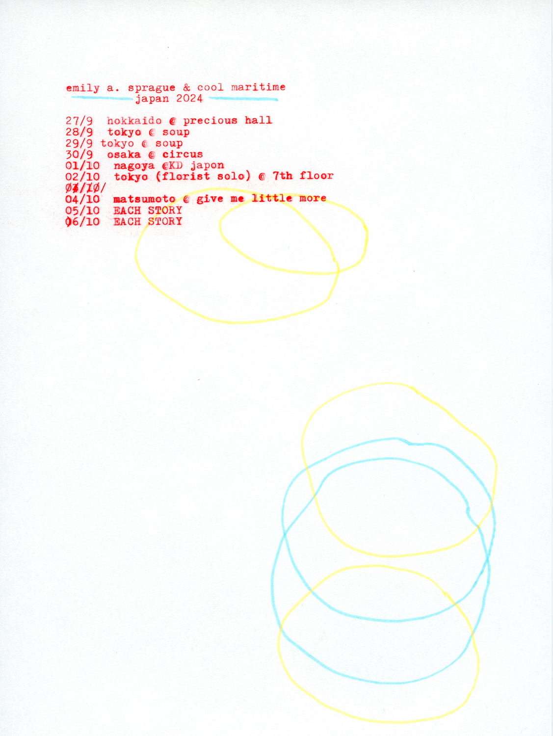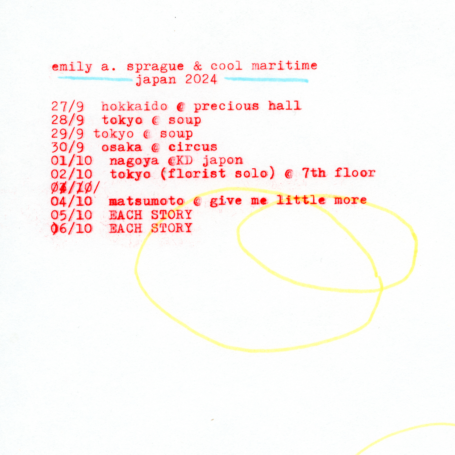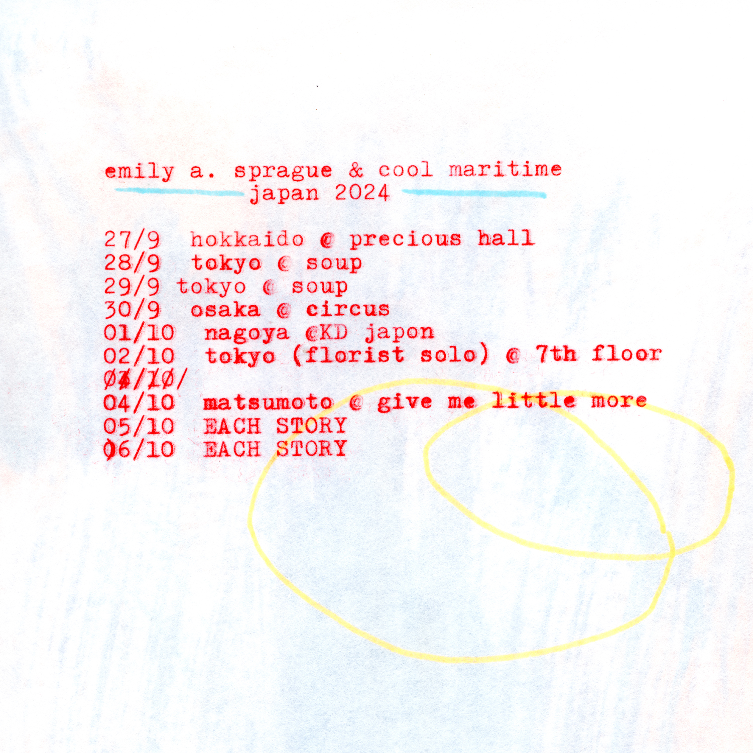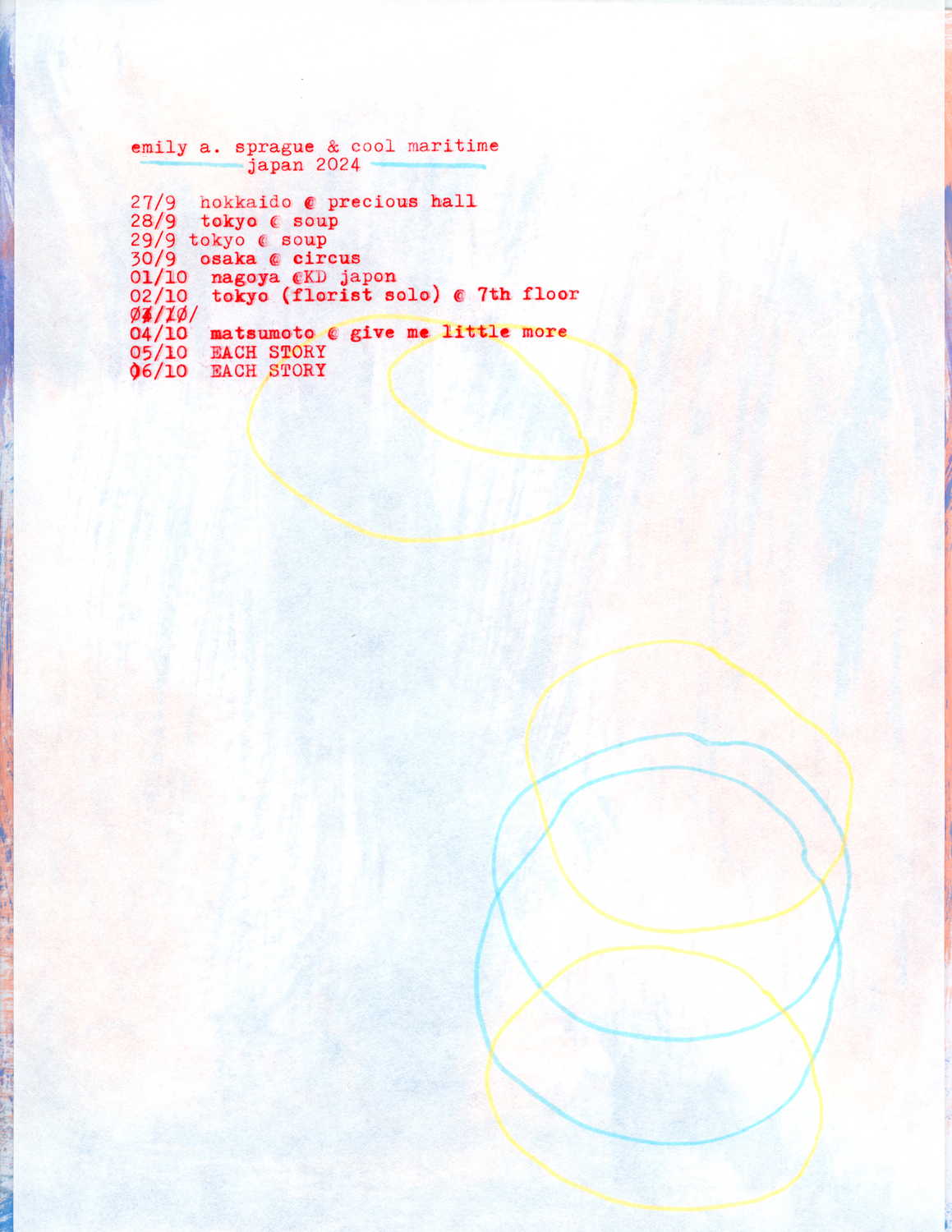 10⽉5⽇(土) / 6⽇(⽇)の2日間に亘って⻑野・川上村 五光牧場オートキャンプ場にて開催される野外リスニング・イベント「EACH STORY ~THE CAMP~ 2024」への出演のため来日が決定しているEmily A. SpragueとSean Hellfritsch aka Cool Maritimeが、同公演に先駆けてカップリングでのジャパン・ツアーを開催。Sprague自身がデザインしたフライヤー・アートが公開されています。