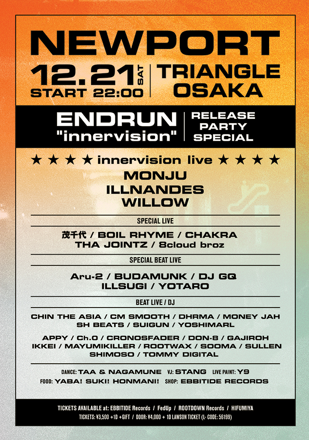コラボレイターにAru-2、BudaMunk、DJ GQ、ILLSUGI、JJJ、O.D.S.、DJ SCRATCH NICE、STUTS、YOTAROを迎えて制作された“ビートセッション・アルバム”『innervision』(PCD-25267 2,500円 + 税)を今年2月に発表したENDRUNが、同作のリリース・パーティを12月21日(土)に大阪・西心斎橋 TRIANGLEにて開催。