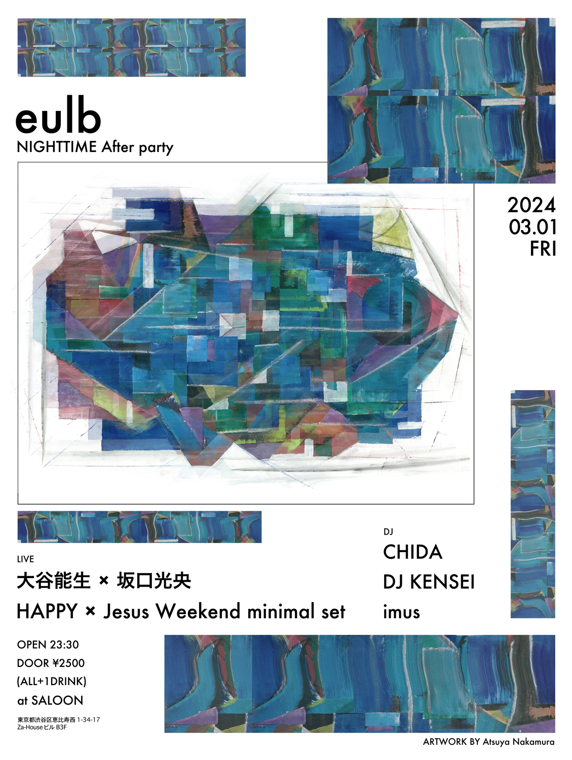 東京を拠点に活動するDJ・imusが企画する「eulb」は、エクスペリメンタルなエレクトロニック・ミュージックとバンドのライヴ・セッションがテーマ。3月1日(金)に開催される東京・下北沢 SPREADでの「DAYTIME session」には、KOKENSHOW(DJ KENSEI + KND + Shoichi Murakami)、嶺川貴子 x MATERIAL(QUEER NATIONS)、同日に東京・代官山 SALOONにて開催される「NIGHTTIME After party」には、HAPPY x Jesus Weekend、大谷能生 x 坂口光央がライヴ・パフォーマンス、CHIDA、DJ KENSEI、imusがDJとして出演。Free Babyronia主宰レーベル「AUN Mute」とのコラボレーションで開催される3月3日(日)の愛知・名古屋 Spazio rita公演「DAYTIME session with AUN Mute」には、Free Babyronia、KND x Shoichi Murakami、Ramza(以上ライヴ)、deadram、imus(以上DJ)が出演するほか、「AUN Mute」のポップアップも決定しています。いずれの公演も、フライヤー・アートはAtsuya Nakamuraによるもの。