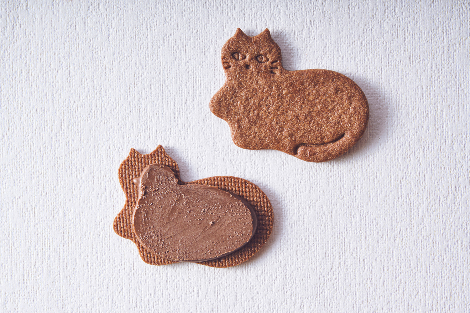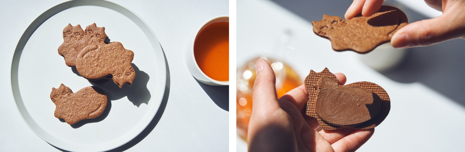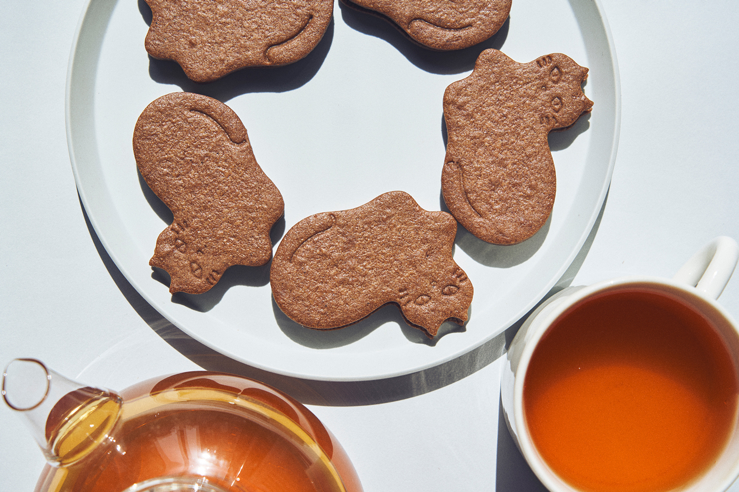 チョコミント好きの坂本と前田が考案し、ミントを前面にフィーチャーした“チョコミント好きのためのお菓子”『My favorite Mint chocolate Cookie』は、オーガニックのペパーミント・オイルを使用したミント・チョコレートをカカオ・クッキーでサンド。香箱座りの猫をあしらったパッケージには、“お菓子を食べ終わってもずっと日常で楽しんでほしい”という両者の思いが込められているとのこと。