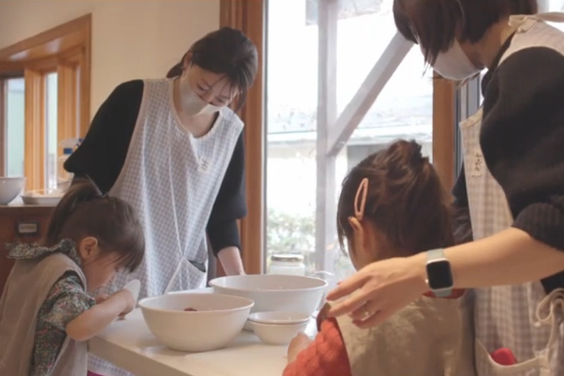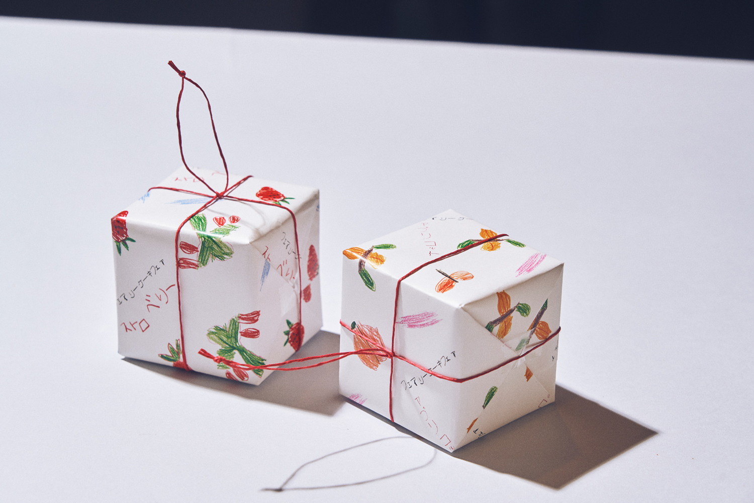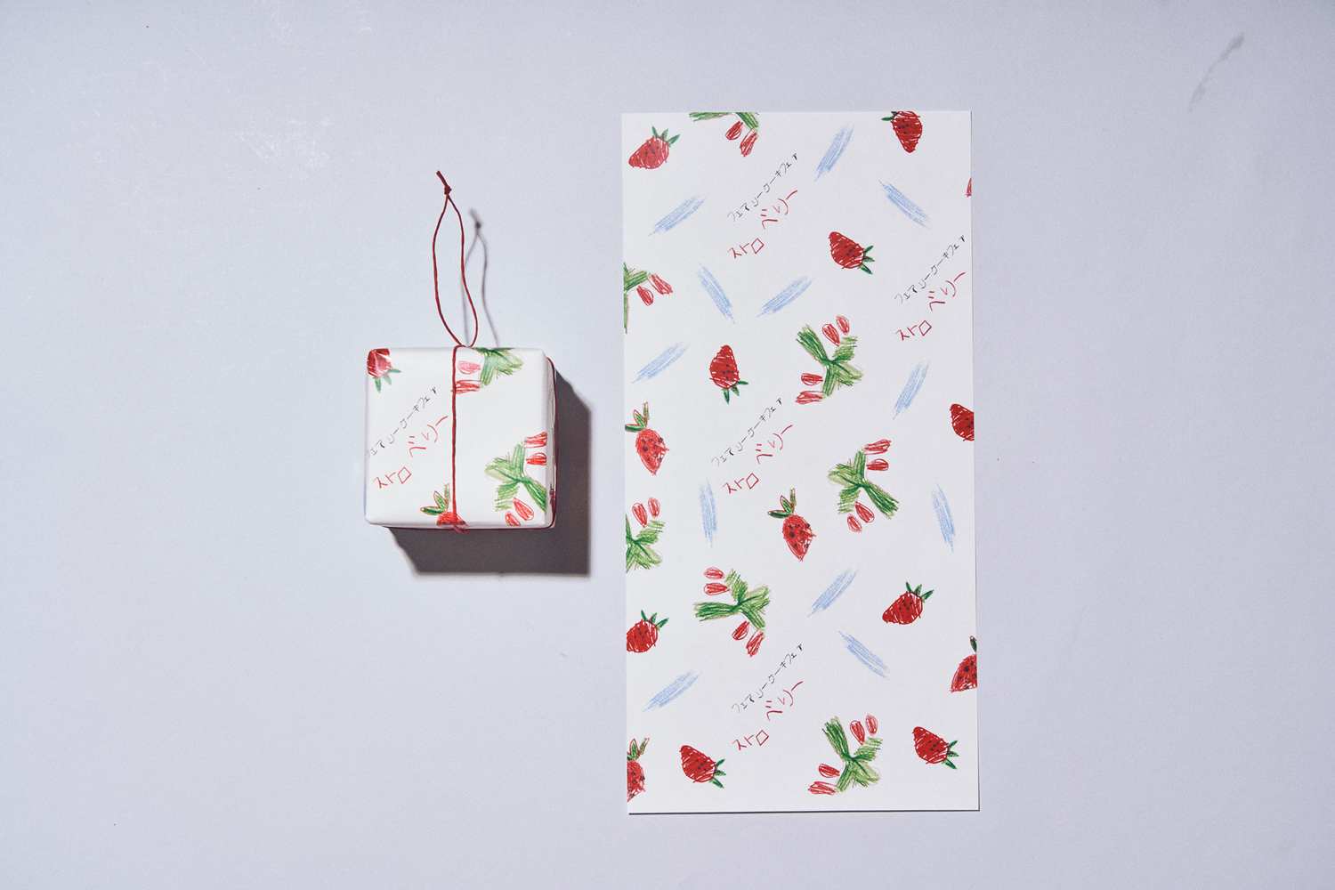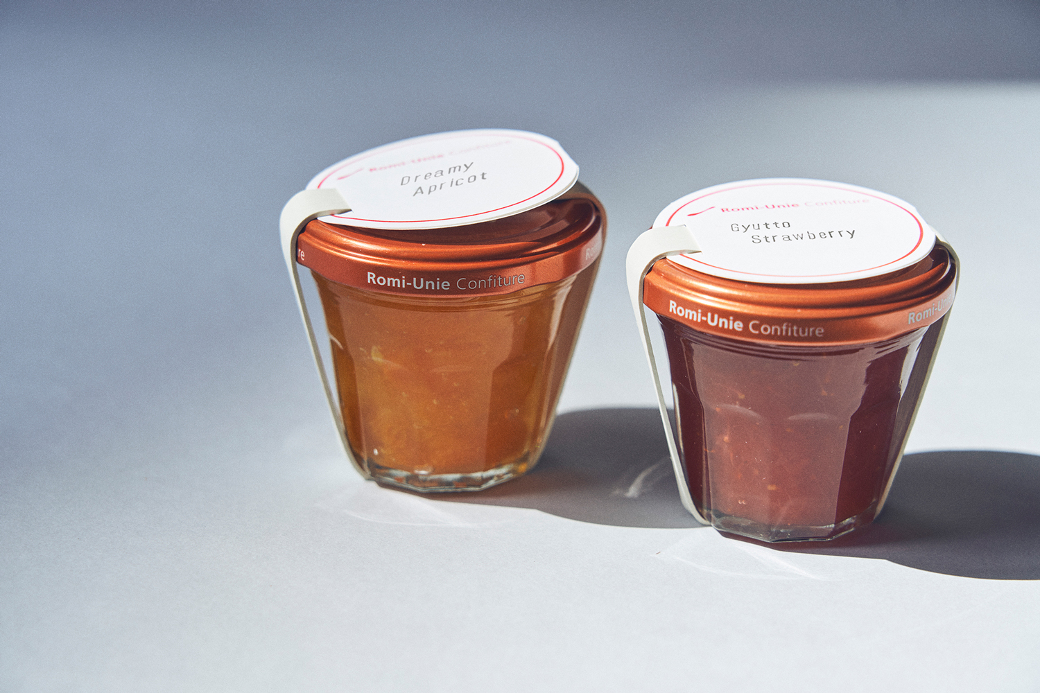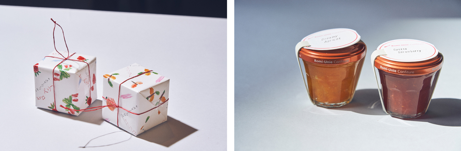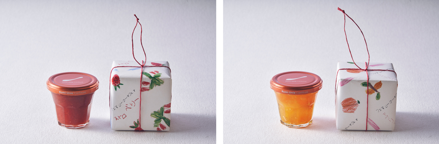 「Romi-unie confiture」のスペシャル・エディションとして数量限定で商品化されたジャム『ギュッとストロベリー』『ドリーミーアプリコット』は、いがらしのアトリエに坂本と前田の子供が集い、アイディアを出し合って創作したジャム。『ギュッとストロベリー』は、いちごにはちみつを加え、果肉を残して食感を活かしつつ、マイルドなとろみ。『ドリーミーアプリコット』ではアプリコットとはちみつに、オレンジの風味を加えています。ラッピング・ペーパーは、ジャム作りの最中に子供たちが始めたドローイングから生まれたデザインです。