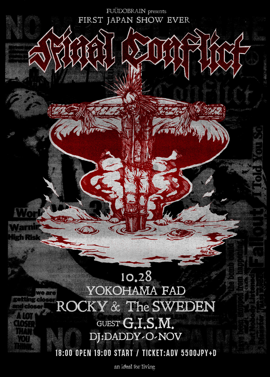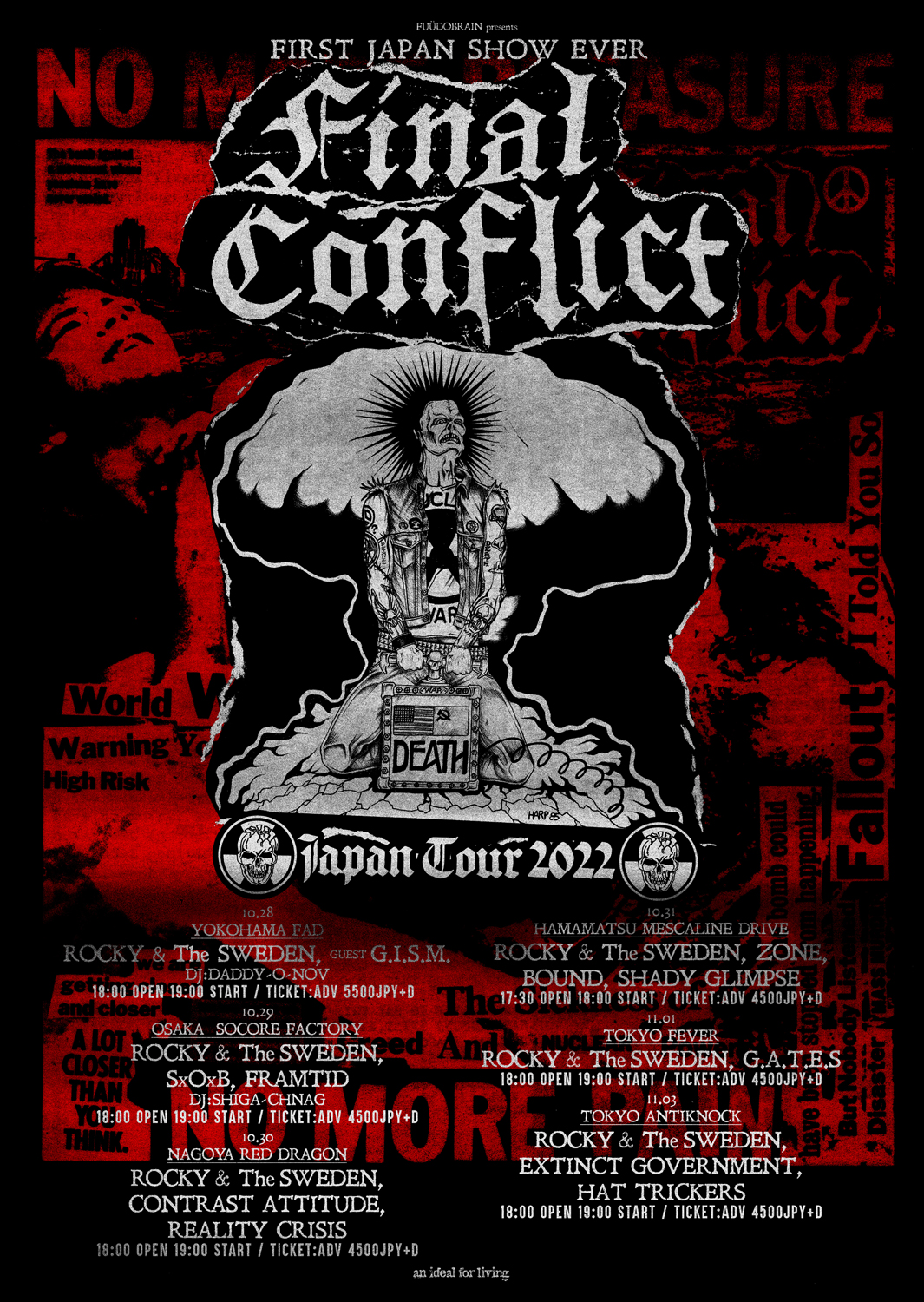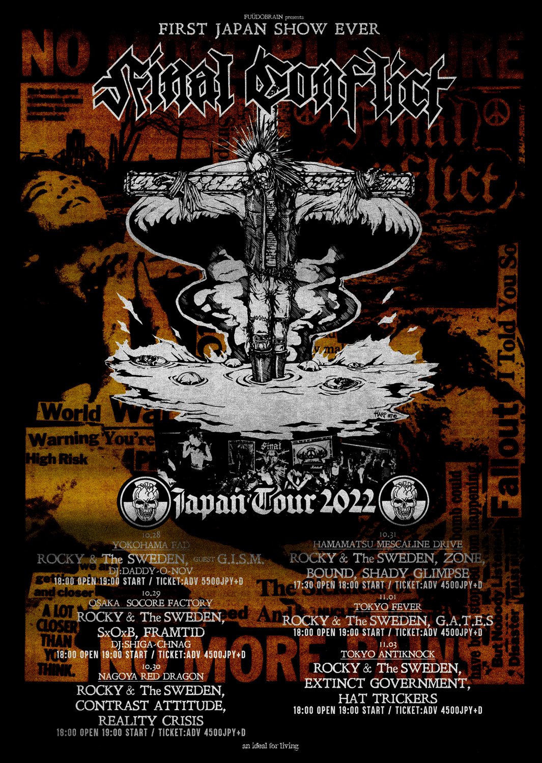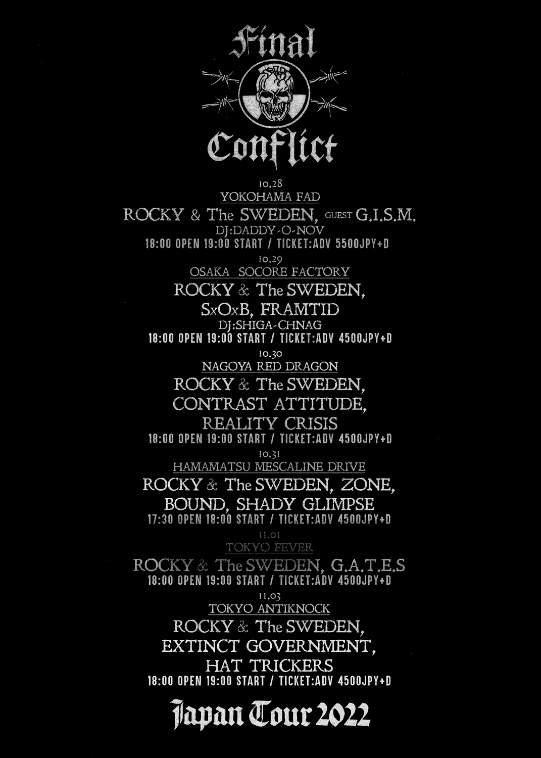 全日程にROCKY & THE SWEDENが帯同する同ツアーは、10月28日(金)神奈川・横浜 F.A.D YOKOHAMA、29日(土)大阪・南堀江 SOCORE FACTORY、30日(日)愛知・名古屋 RED DRAGON、31日(月)静岡・浜松 MESCALIN DRIVE、11月1日(火)東京・新代田 FEVER、3日(木)新宿 ANTIKNOCKの全6公演。初日の横浜公演にはゲストとしてG.I.S.M.の出演が決定しています。なおFINAL CONFLICTはツアー中、1987年にPushead主宰「Pusmort」からリリースされた1stフル・アルバム『Ashes To Ashes』からの楽曲を中心としたセットリストでのパフォーマンスを予定しているとのこと。