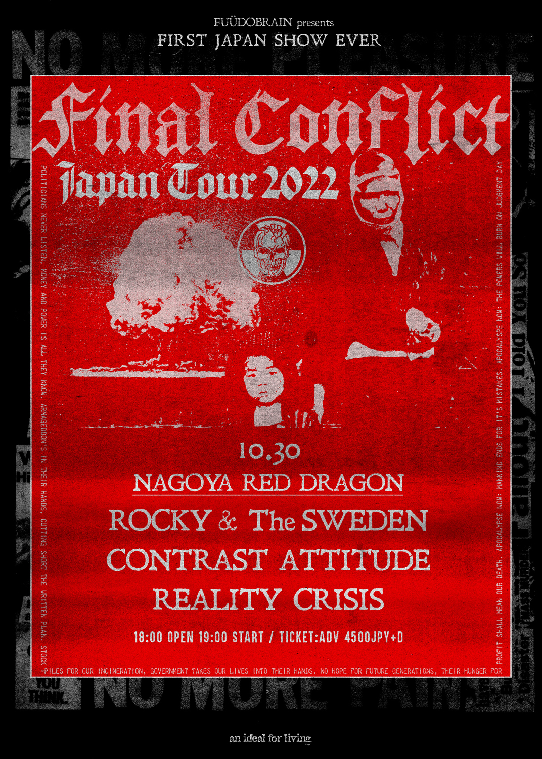 2013年のリユニオン以降も精力的に活動し、今年もNAPALM DEATH、NEGATIVE APPROACHらとの共演や、1985年デモのリイシューなどが話題となっている米カリフォルニアのポリティカル・ハードコア・パンク伝説FINAL CONFLICTが、10月に「FUÜDOBRAIN」の招聘で初来日。ジャパン・ツアーの開催が決定しています。