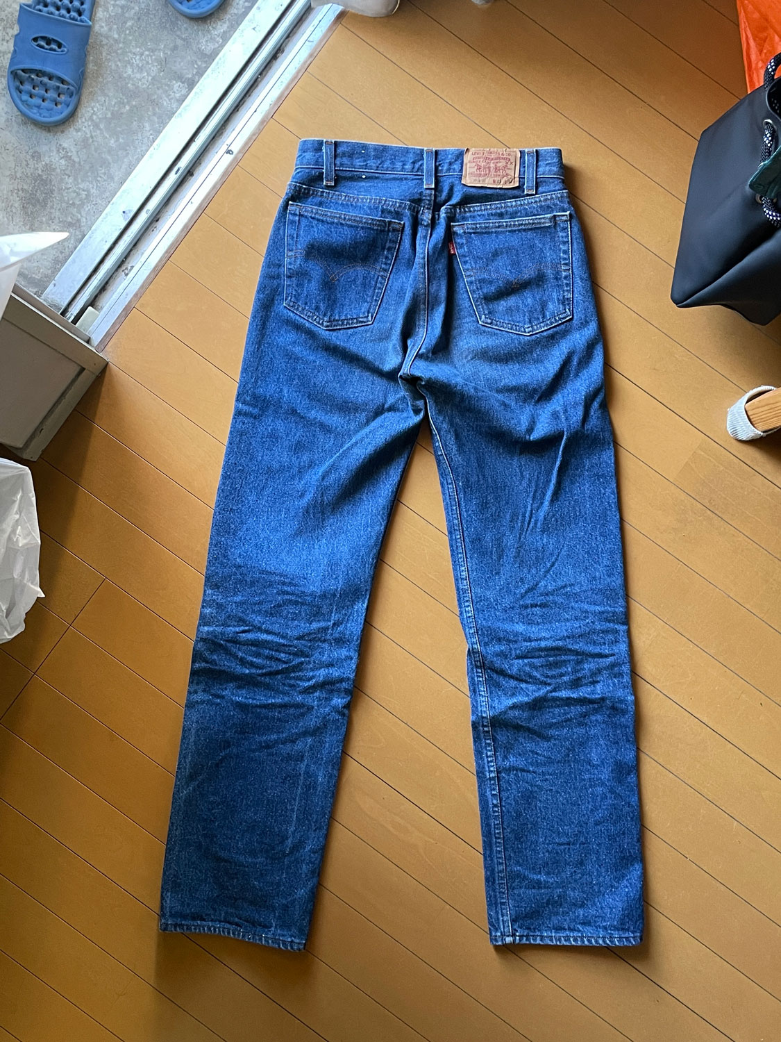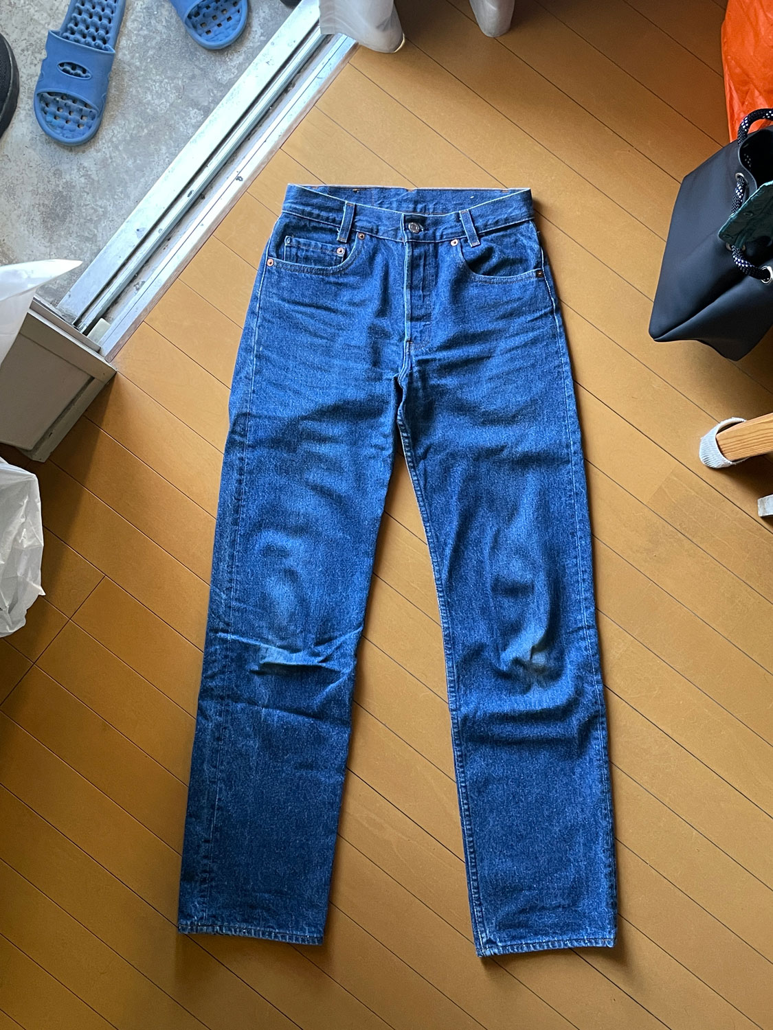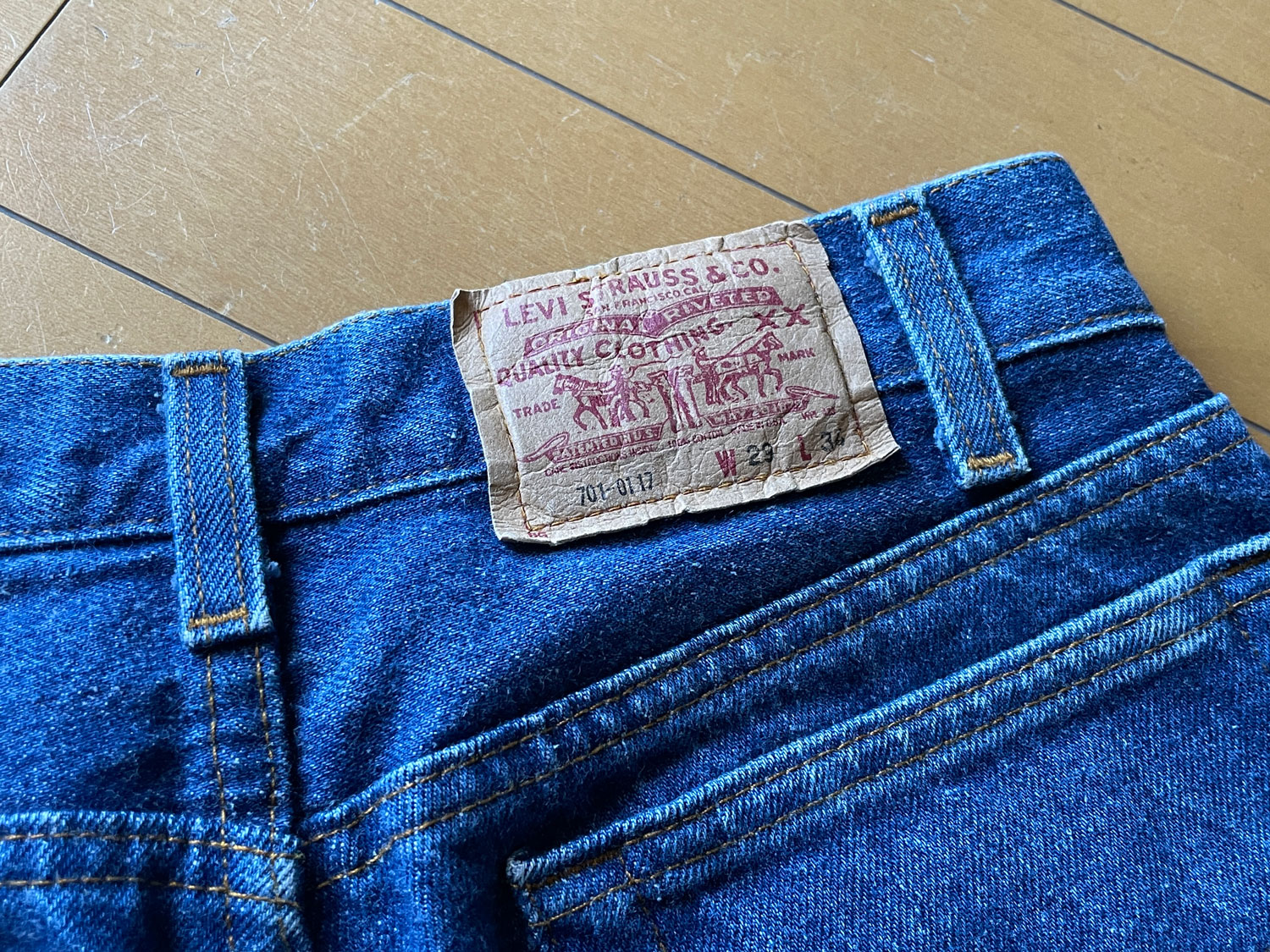 「レディース用の501で。LEVI’Sの701っていう。7が頭のモデルは全部レディース。これはさらにスチューデント・モデルっていうちょっと小さいモデル。フロントのボタンが普通5つなのが4つだったりコンパクト。コインポケットの縫製が違ったりする。80年代のもの」