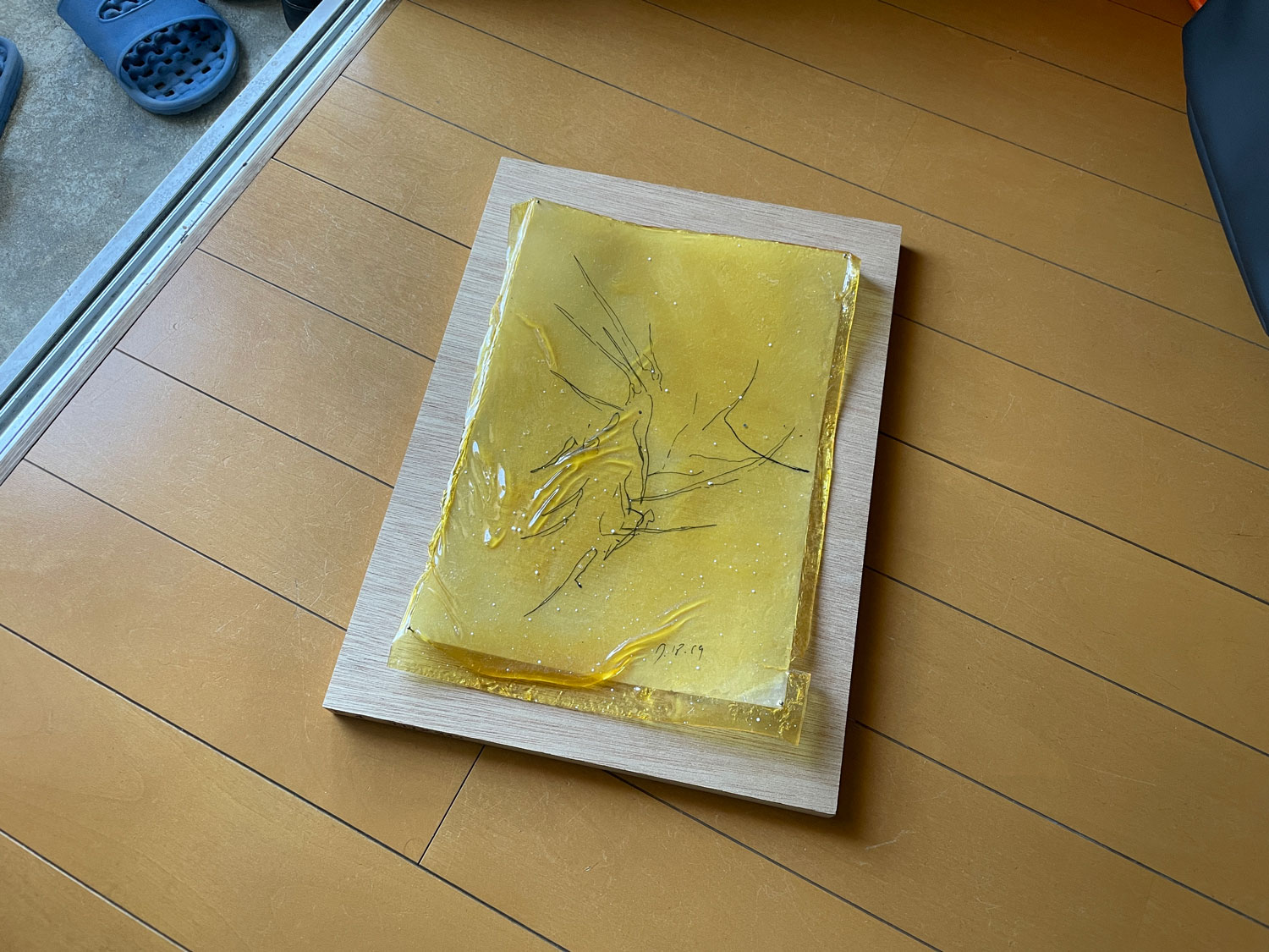「作品はTAKUYA WATANABE TAKUYAくんの絵とか。ANAGRAでやってたとき(* 6)に出してた、油彩絵の具を溶くものを固めたやつ。永遠にそれが固まらないぬるっとした状態でずっとある、みたいな作品があります(作品を手に取る)。だんだん黄色さが増してきている気がする。ふにゃふにゃなんです。虫ピンで止めてある。これが一番彼のタトゥーの作風と似てるからいいなって」