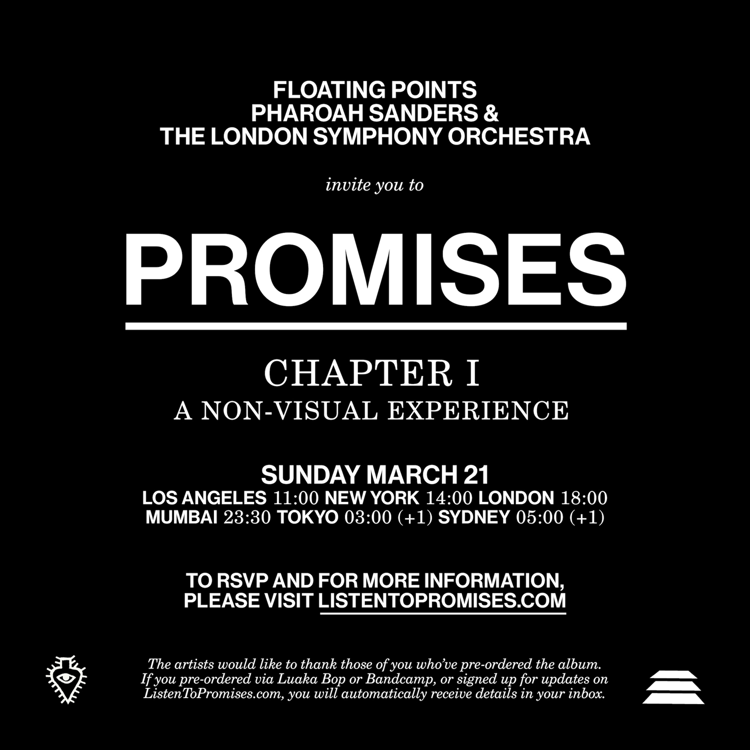 2019年発表の目下最新アルバム『Crush』(Ninja Tune)が話題作となったSam Shepherd aka Floating Pointsと、スピリチュアル・ジャズの象徴・Pharoah Sandersが、ロンドン交響楽団を迎えたコラボレート作品『Promises』をDavid Byrne(TALKING HEADS)主宰「Luaka Bop」からリリース。3月26日(金)に国内盤CD(PCD-94026 2,400円 + 税)、4月7日(水)には国内仕様の日本語帯付きヴァイナル(PLP-7135 4,500円 + 税)も発売されます。
