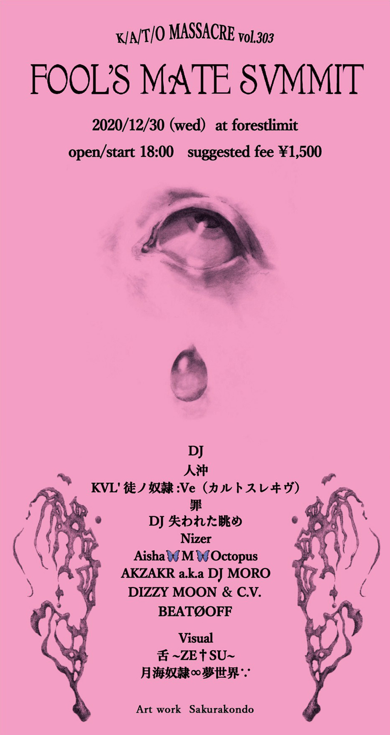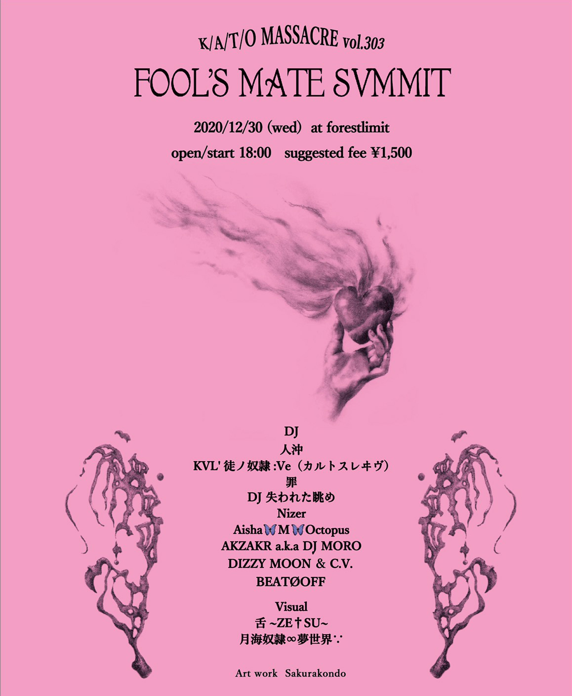 昨年末に東京・幡ヶ谷 Forestlimitにて開催され、“Visual kei”にフォーカスした趣向で現象を巻き起こした見えないものを見ようとする会合「FOOL’S MATE SVMMIT」が、今年も12月30日(水)18:00より「K/A/T/O MASSACRE」第303回とのコラボレーションで再び開催。昨年同様、画家・近藤さくらが手がけたヴィジュアルが公開されています。