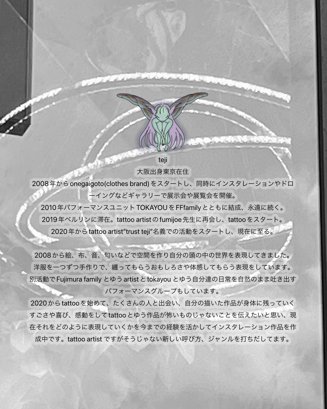 クロージング・ブランド「onegaigoto」デザイナーでもあるタトゥアーのtejiが、グループ・エキシビション「FOR ANTICIPAITION」を大阪・粉浜 art gallery opaltimesにて4月22日(土)から5月7日(日)まで開催。