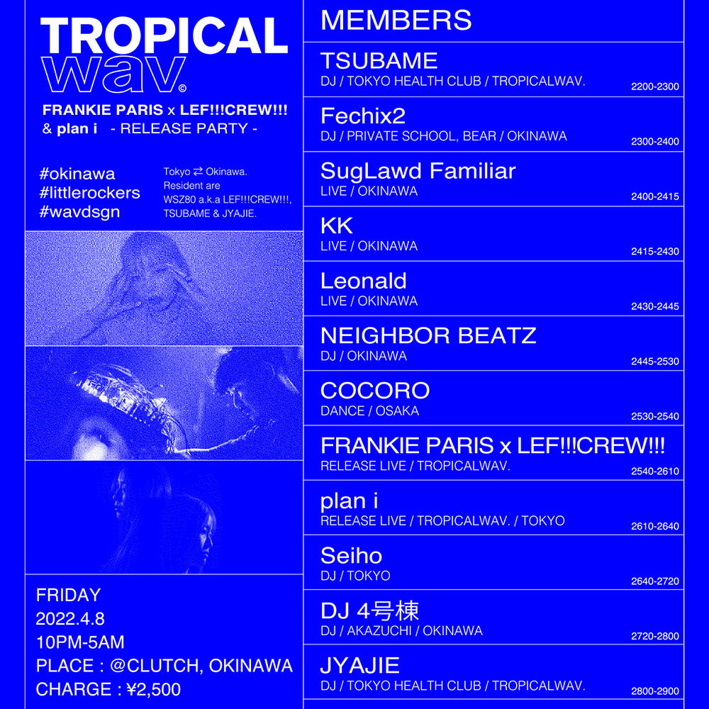 なおFRANKIE PARISとLEF!!!CREW!!!は、3月末にFRANKIE PARISをフィーチャーした目下最新シングル『FACE』をリリースしたばかりのplan iとのダブル・リリース・パーティを4月8日(金)に沖縄・那覇 CLUB CLUTCHにて開催。両者のパフォーマンスに加えKK、Leonald、plan i、SugLawd Familiarによるライヴ、DJ 4号棟(AKAZUCHI)、Fechix2(BEAR & PRIVATE SCHOOL)、JYAJIE(TOKYO HEALTH CLUB)、NEIGHBOR BEATZ、Seiho、TSUBAMEによるDJも予定されています。