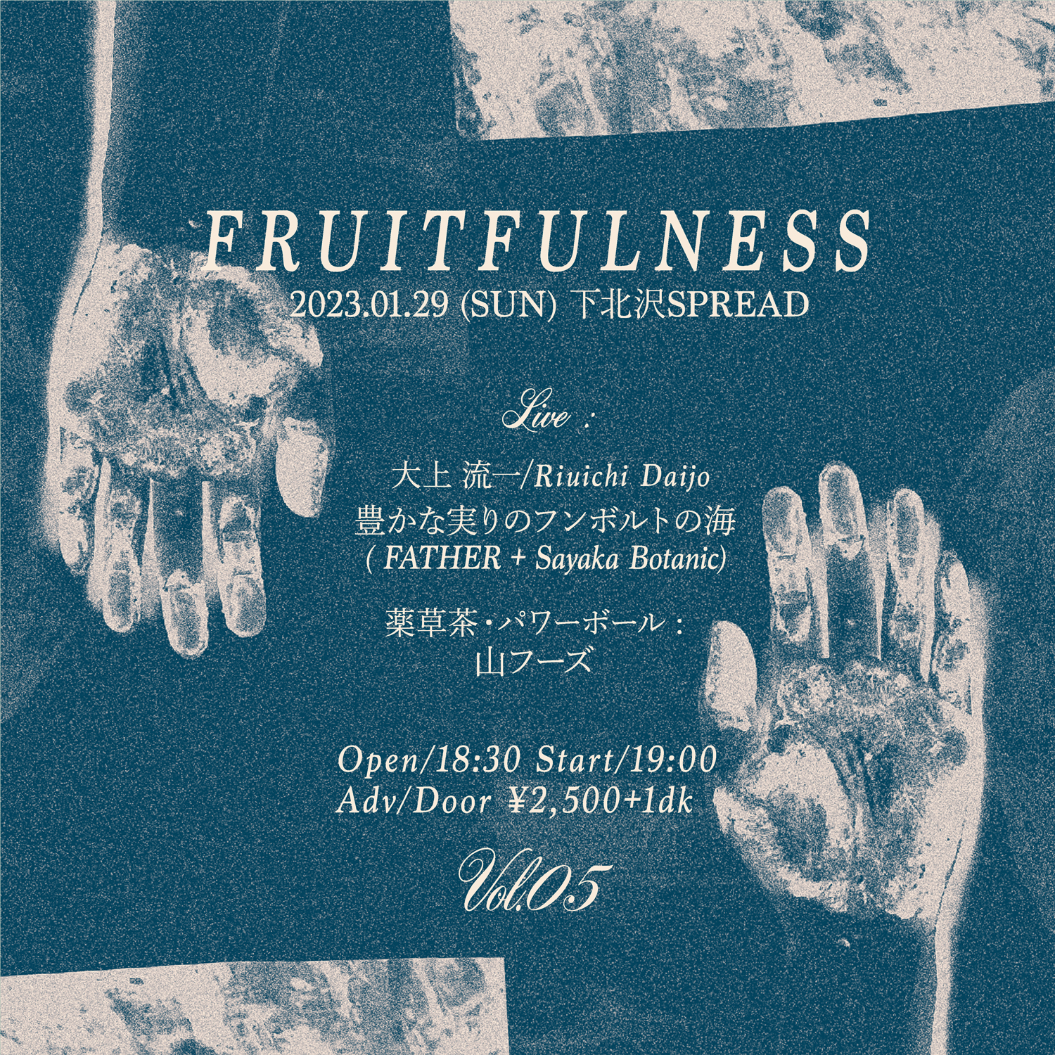そして、ついに最終回となる第5回目のゲストは、ギタリストであり、即興演奏スペース「Permian」の立ち上げ人でもある大上流一さんをお招きします。あるがままで存在し、精神性の高さを感じる大上さんの演奏は、まるで地殻に咲く鉱物のような美しさがあります。音楽の源流ともいえる大上さんの演奏をぜひ生で体感しに来てください。FATHERとSayaka Botanicは、不定期のユニット“豊かな実りのフンボルトの海”で演奏します。最終回の「Fruitefulness」お見逃しなく!