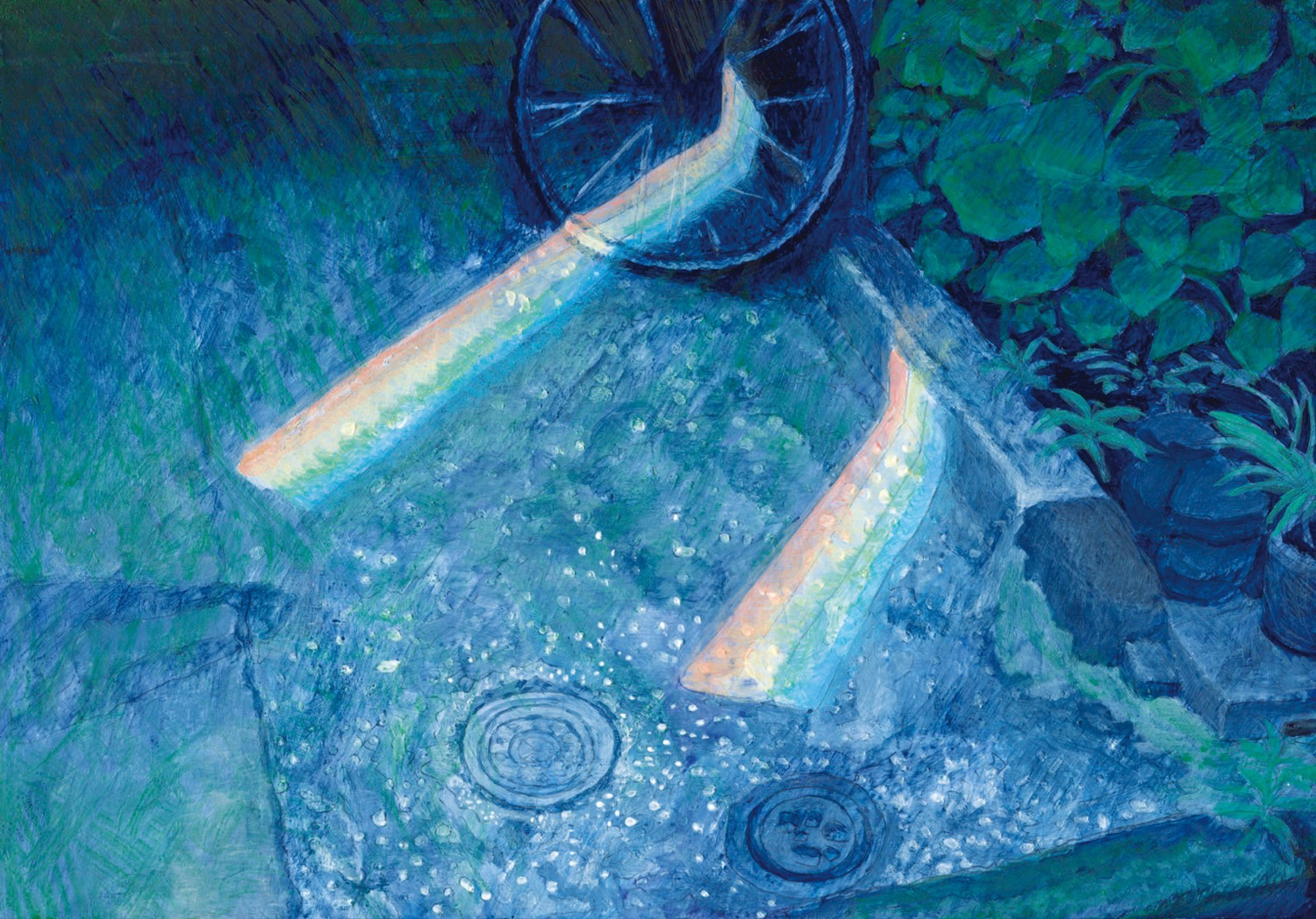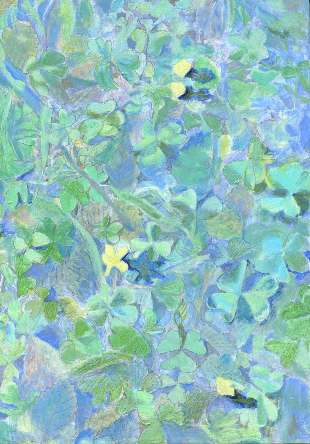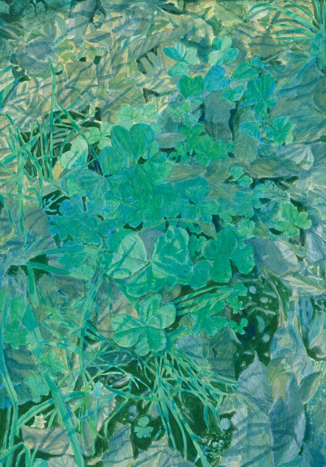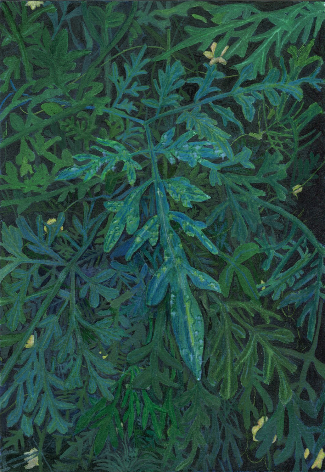 同展では、アクリル絵の具、色鉛筆を用いたメイン・ヴィジュアル『隠された光』をはじめ、夕方から夜明け前の植物をモチーフに描いた作品
