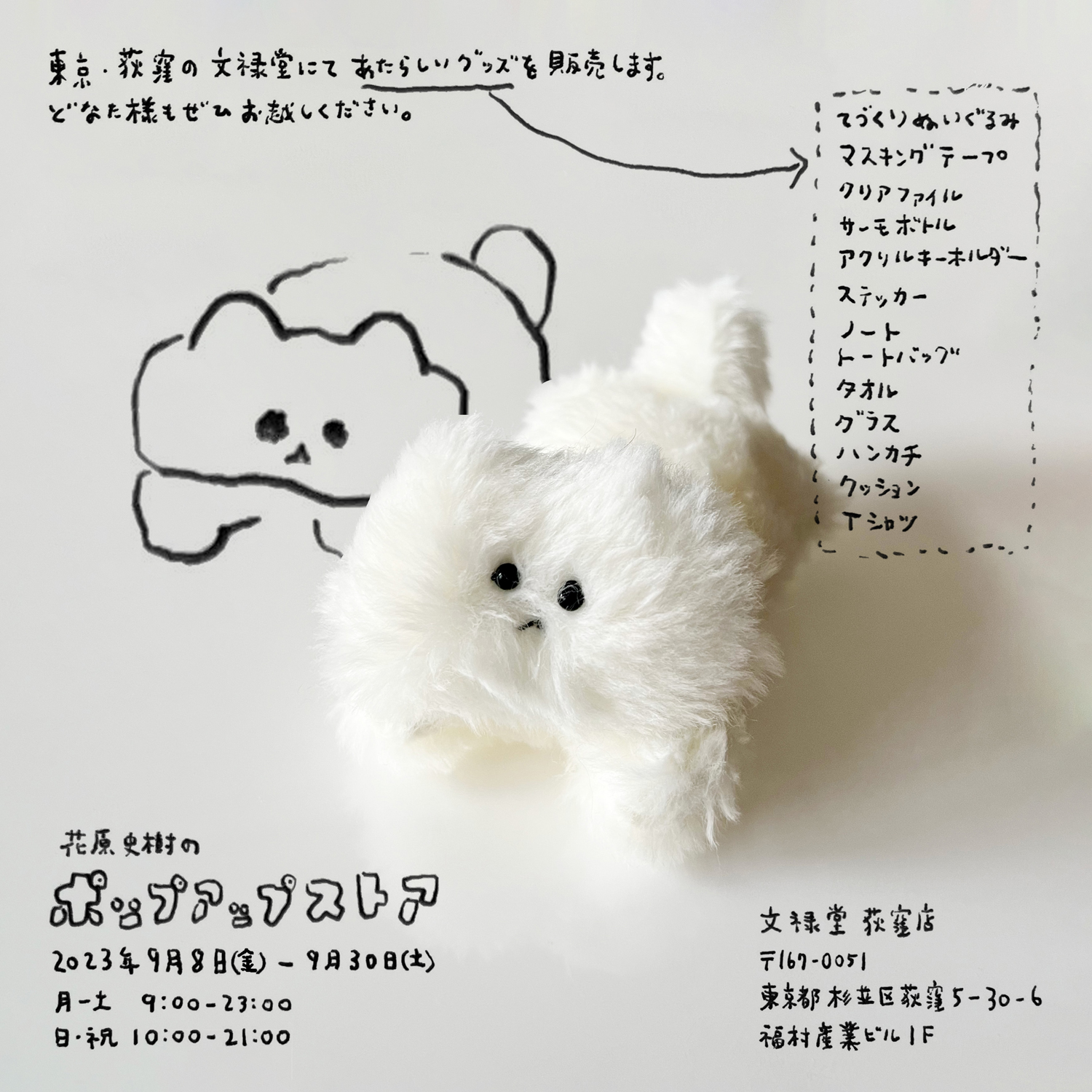 SNSにて連載中の漫画『ねんねんころころ』が好評を博している花原。ポップアップ・ストアでは、新作のマスキングテープ、クリアファイル、サーモボトル、アクリルキーホルダー、ステッカー、ノート、トートバッグ、タオル、グラス、ハンカチ、クッション、Tシャツを販売。ハンドメイドのぬいぐるみの販売も予定されています。