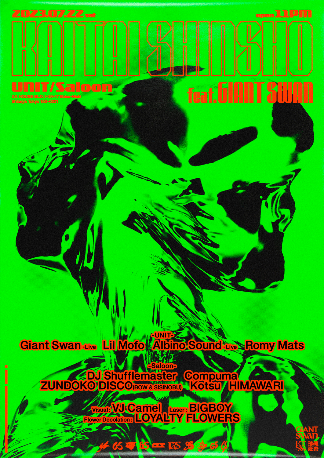 初来日を果たし、7月15日から17日にかけて新潟・湯沢 苗場グリーンランドにて開催された「rural 2023」に出演した英ブリストルのデュオ・GIANT SWAN(Harry Wright aka Mun Sing + Robin Stewart)が、Romy Mats主催パーティ「解体新書」に出演。ジャパン・ツアー「解体新書 presents. Giant Swan Japan Tour 2023」を7月21日(金)京都・木屋町 West Harlem、22日(土)東京・代官山 UNIT + SALOONの日程で開催します。