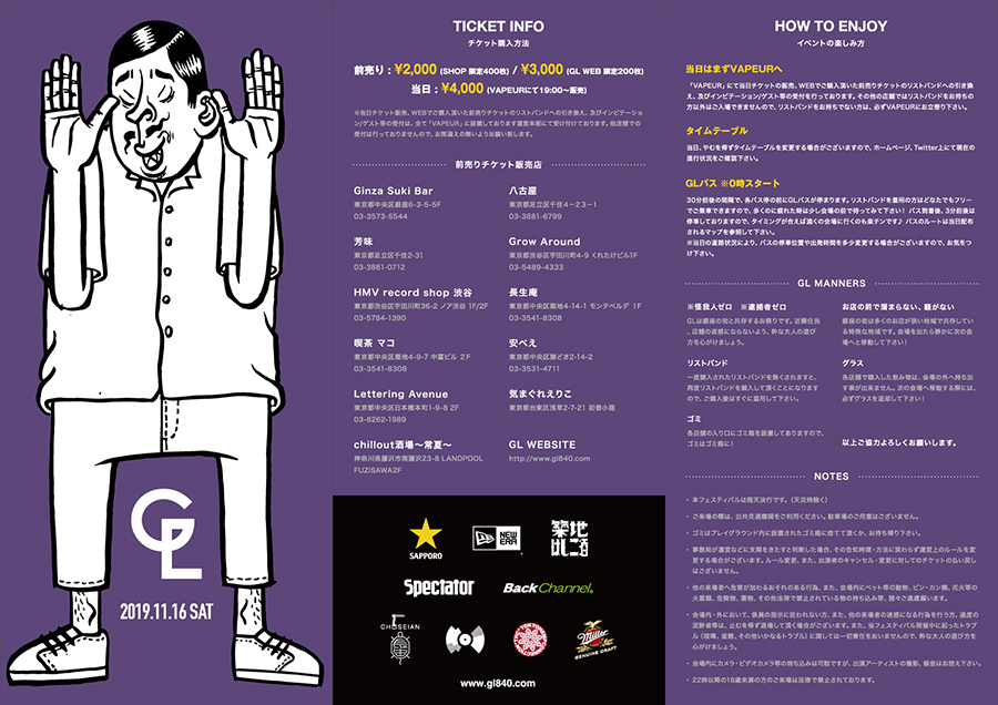 2006年の初開催以降、13年に亘って東京・銀座エリアの“町おこし”企画として親しまれてきたサーキット・イベント「GL」が今年も11月16日(土)に開催決定。オンラインおよび対象店舗(Ginza Suki Bar / 八古屋 / 芳味 / Grow Around本店 / 喫茶 マコ / 長生庵 / HMV record shop 渋谷 / 安べえ / 気まぐれえりこ / Lettering Avenue / cillout酒場〜常夏〜)での前売チケット販売が開始されています。