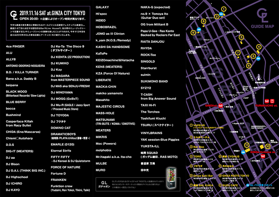 出演は、4ce FINGER、B.D. / KILLA TURNER、beipana、BLUE BERRY、BUSHMIND、DJ Highschool、DJフクタケ、ETERNAL STRIFE、FIFTY FIFTY(DJ Kensei + DJ Quietstorm)、FORCE OF NATURE、MACKA-CHIN、MASS-HOLE、MIKRIS、MURO、STARRBURST、THE TORCHES、YUKSTA-ILLら90組強。イベントの本部となるフレンチ・バー「VAPEUR」をはじめ、「エルボラーチョ」「Bar Boo」「TORO」「ブギウギ」「Ginza Suki Bar」「銀座 BAL KAKA」「銀座CYGNUS」「月のはなれ」「GINZA ROOTS TOKYO」「SUZU CAFE」の全11店舗が会場として発表されています。