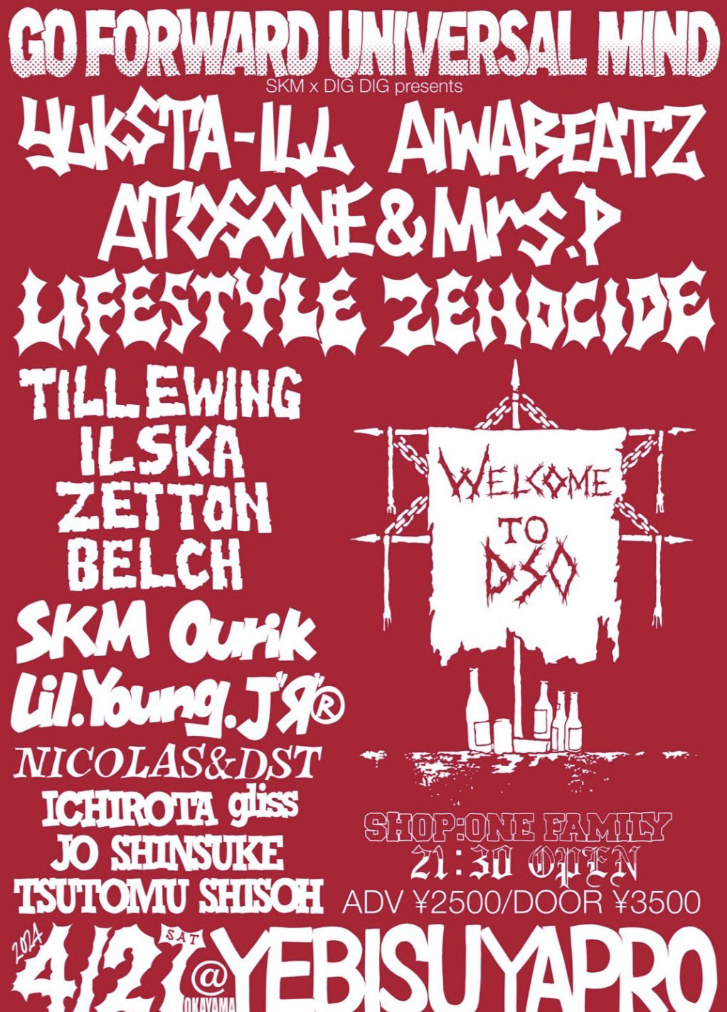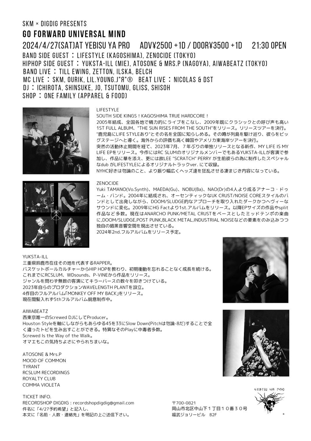 昨年9月発表のフル・アルバム『Space Killer Mark』(One Family Recordings)が好評を博している岡山のラップ・デュオSKM(BAG + YZ)と、ヒップホップ / ハードコアをシームレスに扱った品揃えで知られる同地の銘店「record shop DIGDIG」が、共同企画「GO FORWARD UNIVERSAL MIND」を4月27日(土)に岡山・YEBISU YA PROにて開催。