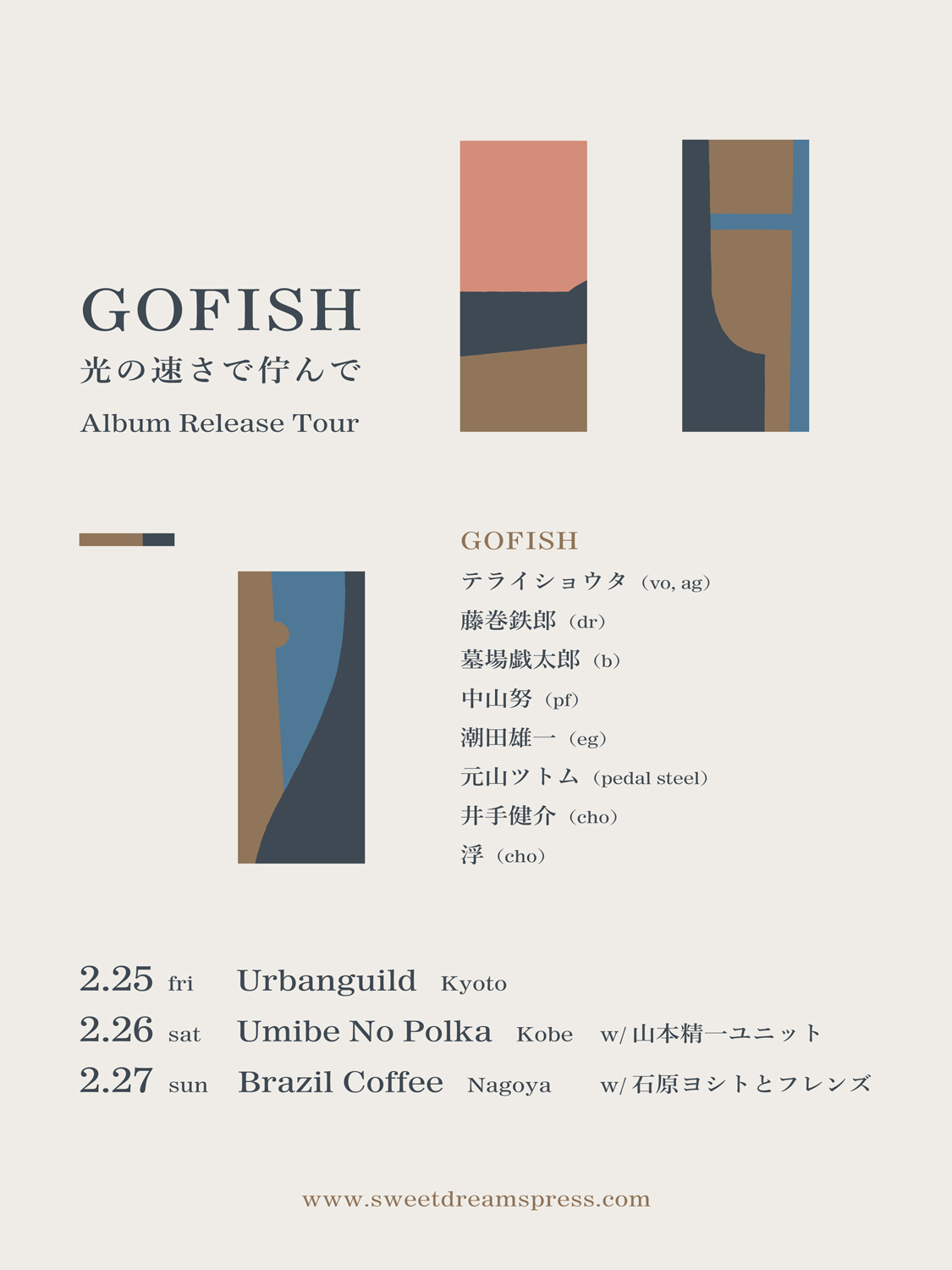 昨年5月に目下最新フル・アルバム『光の速さで佇んで』(Sweet Dreams Press)を発表し、同年7月に東京・渋谷 WWWにて開催したリリース記念の単独公演も好評を博したテライショウタ aka GOFISHが、昨年8月に予定されながらもキャンセルとなっていたアルバムのリリース・ツアーを2月25日(金)よりスタート。