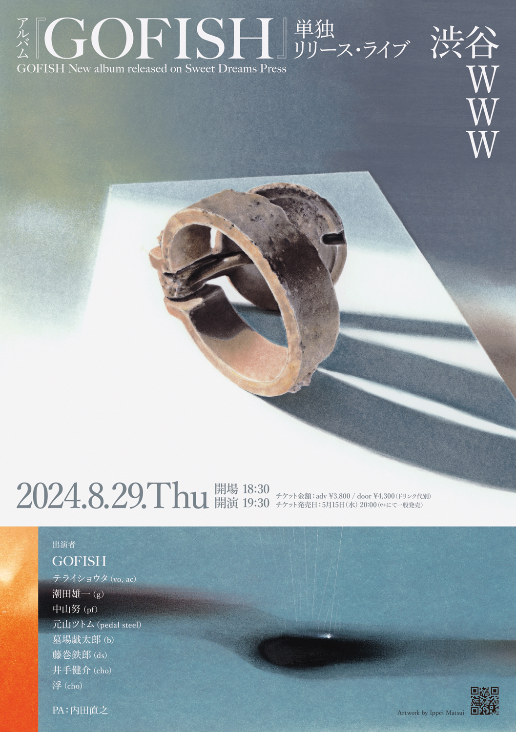 同公演は、『GOFISH』同様に浮(cho)、藤巻鉄郎(dr)、墓場戯太郎(b)、井手健介(cho)、元山ツトム(pedal steel)、中山 努(pf)、潮田雄一(g)を演奏陣に迎え、アルバムのレコーディング / ミキシングを担当した名匠・内田直之(DRY & HEAVY, FLYING RHYTHMS, LITTLE TEMPO)によるライヴPAでのパフォーマンス。当日に先駆けて公開されているフライヤー・アートも、アルバムのパッケージを手掛けた松井一平(アートワーク)と惣田紗希(デザイン)が制作しています。