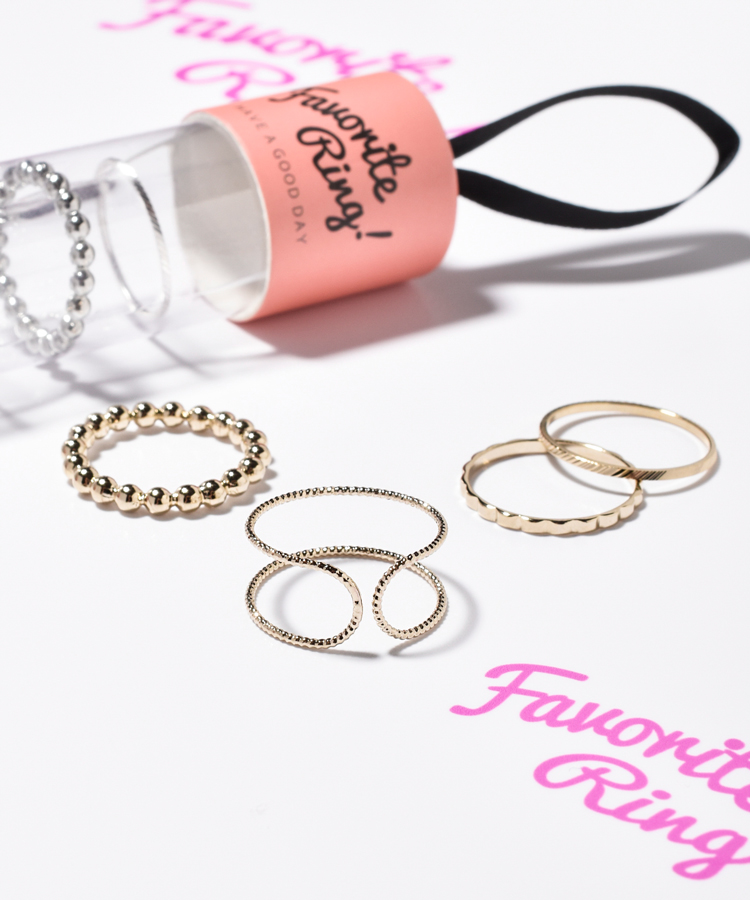 華奢でシンプルなデザインのリングを4本セットした『Favorite Ring!』は、「ZOZOTOWN」内のショップ「perky room」で販売中。メタル素材でどんなファッションにも合わせやすく、1年を通して使用可能。専用のカラフルな筒型のケースは、贈り物にも適しています。