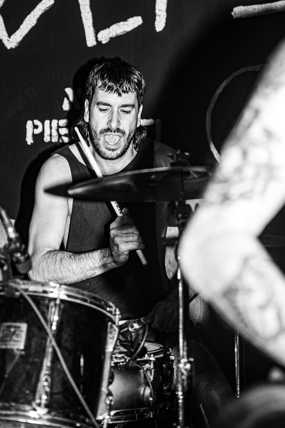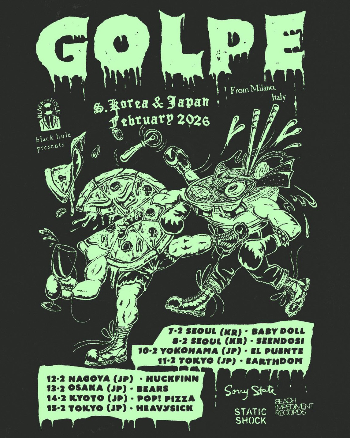 「過去6年間で、このしょうもない音楽を一緒に演奏してくれて、曲を覚えてくれる友達がたくさんいて本当に恵まれていたと思う。たぶんこれまでに30人くらいの人がGOLPEとしてステージに立ってくれてるよ! どのショウやツアーかによってメンバーは変わるよ。というのも、僕と同じくらいのペースでライヴをやってくれる固定メンバーを見つけるのはほぼ不可能だからね。今回の日本ツアーでは、ギターがOlly(ASTIO, SLOI)とPilli(Filippo Colombo | CONTRA, LABRADORS)、ドラムがLuoca(Luca Orzi | DADAR, SHITTY LIFE)、ベースがChris(Francesco Lampredi | M!R!M)だよ。みんな友達で、ここ数年のライヴをいろんな編成でやってきた中でも特によく一緒に演奏してきたメンバーだ」