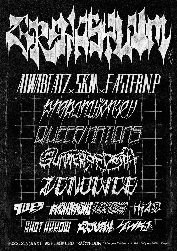 2010年の第5回以来実に12年ぶりの開催となる「GRAYASYLUM」。第6回ではZENOCIDEのほか、SKMとEASTERN.PをフィーチャーするAIWABEATZ、一昨年のフル・アルバム『perception』に続いてAIWABEATZによるスクリュー・ミックス『AIWABEATZ vs. preparationset』も好評のpreparationset、MATERIAL(CARRE | MGMD A ORG.)による単独プロジェクト・QUEER NATIONS、昨年の最新デモ音源で新境地を見せたSUMMER OF DEATHがライヴ・パフォーマンス。ラウンジDJとして9ues、COVAH、M28、moshimoshi aka 黒電話666、SHOT-ARROW、YWK1の出演も決定しています。チケットの予約はTIGETにて受付中。